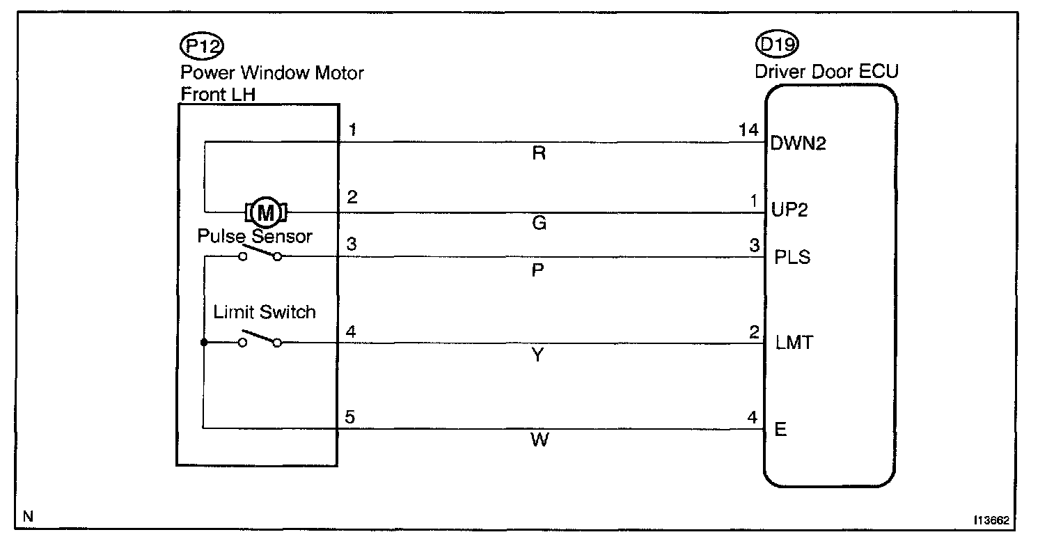 CIRCUIT DESCRIPTIONJam protection limit switch is built-in the power window motor. This switch functions to turn "OFF" before the top dead center, and ECU reads this "OFF" signal resulting in closing the window fully.