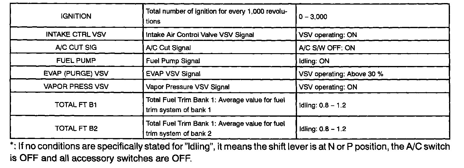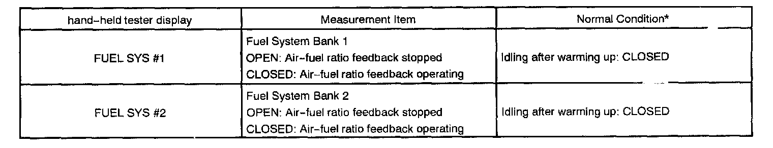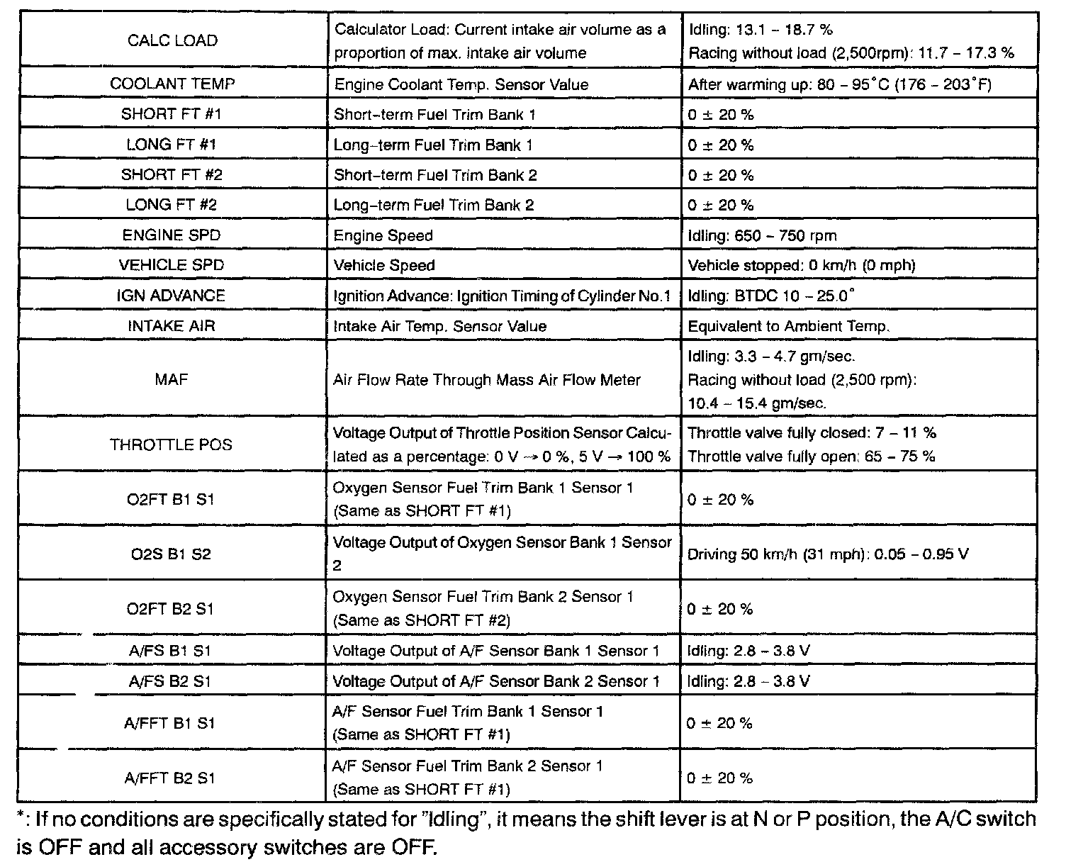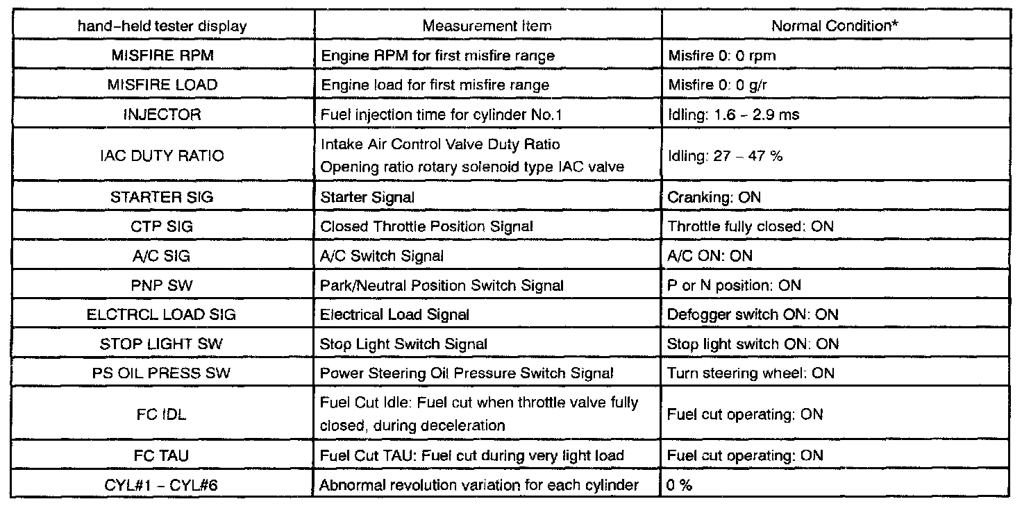 ENGINE OPERATING CONDITIONNOTE: The values given for "Normal Condition" are representative values, so a vehicle may still be normal even if its value varies differ from those listed here. So do not decide whether a part is faulty or not solely according to the "Normal Condition" here.