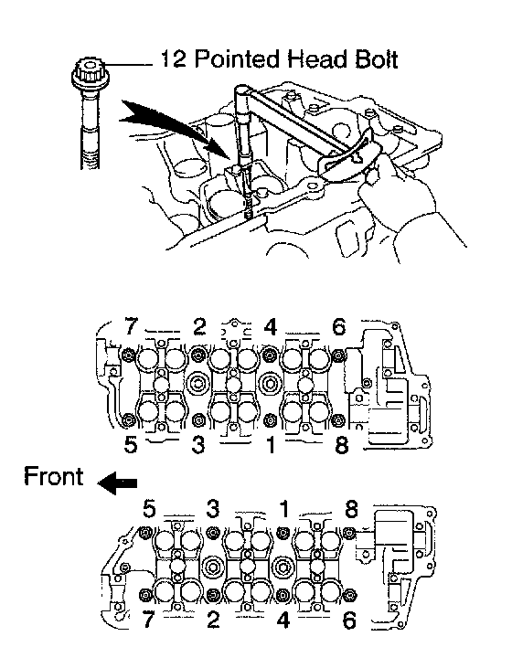 Install and uniformly tighten the cylinder head bolts on each cylinder head in several passes and in the sequence shown, then repeat for the other side, as shown.