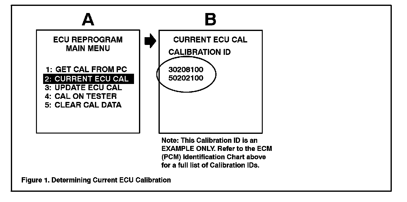 2. Connect the Diagnostic Tester to the vehicle and select "CURRENT ECU CAL" from the ECU REPROGRAM MAIN MENU." To determine the vehicle's current ECM calibration, see Figure 1 shown.