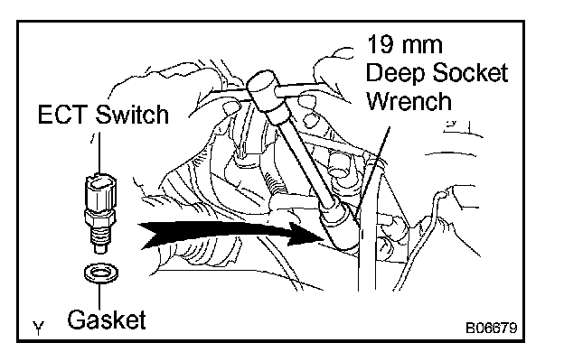 b. Using a 19 mm deep socket wrench, remove the ECT sensor and gasket.
