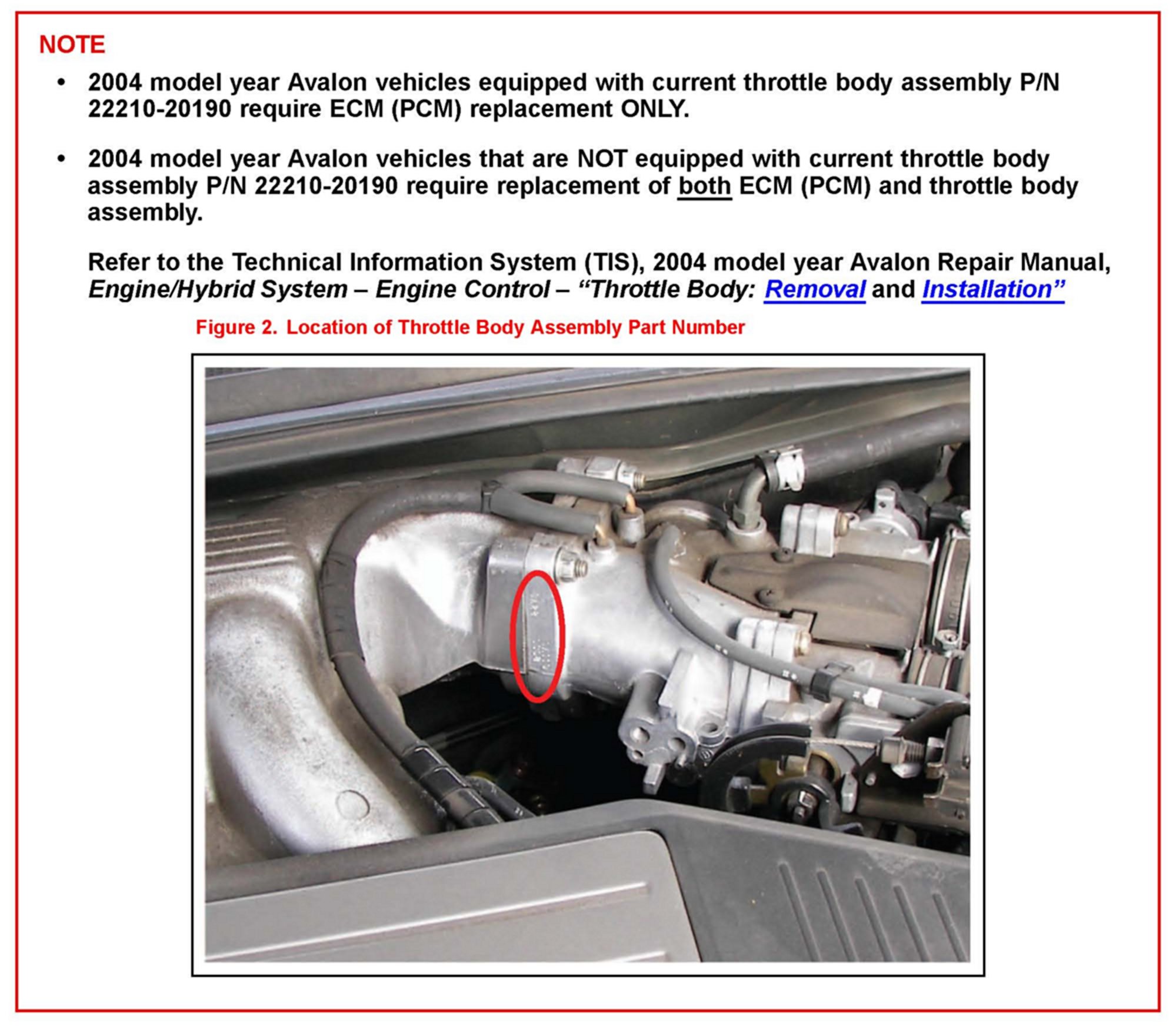 Some 2000 - 2004 model year Avalon vehicles equipped with a 1MZ-FE engine may exhibit an intermittent "pinging" or "knocking" noise when accelerating slowly up a grade. The Engine Control Module (ECM) (SAE term: Powertrain Control Module/PCM) logic has been modified to improve this condition. Use the following procedure to address customer concerns.