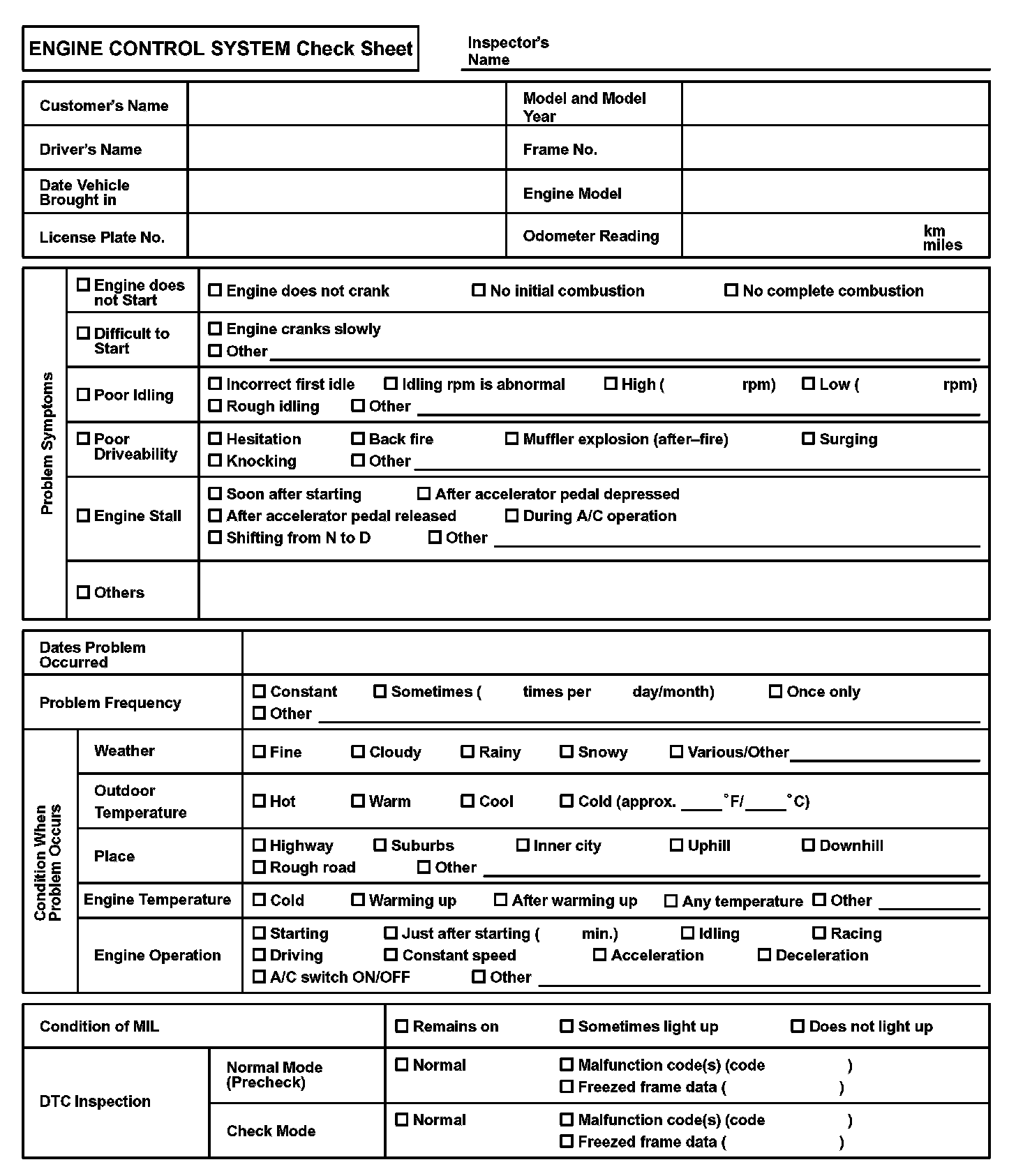 Engine Control System Check Sheet: