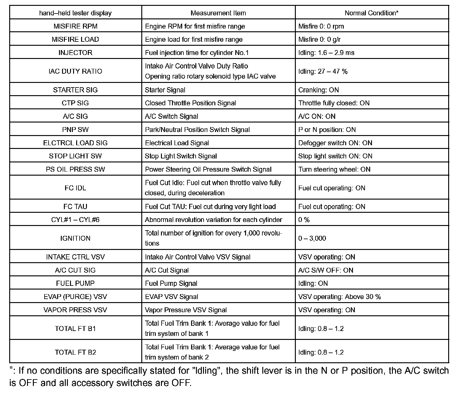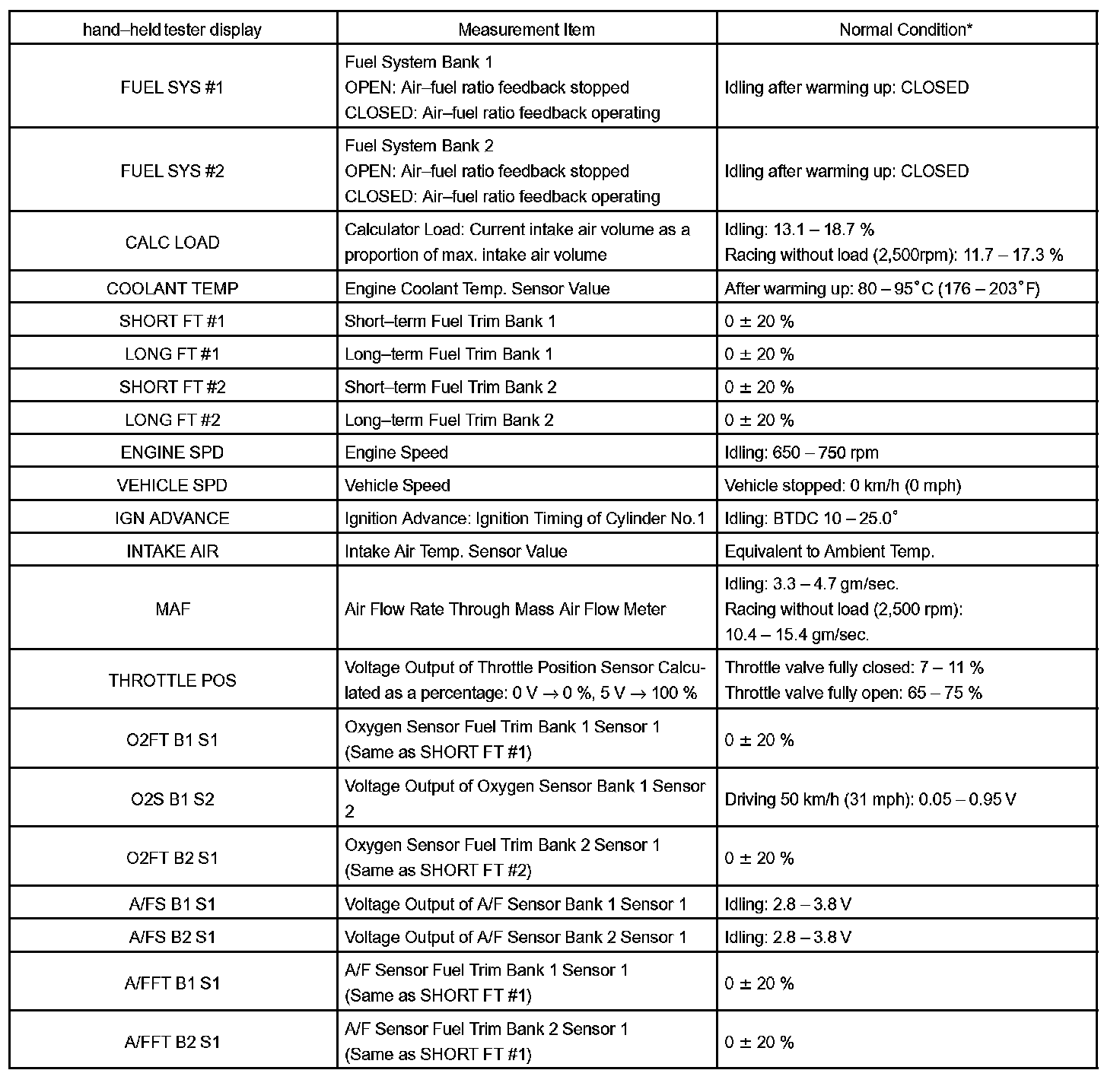 DATA LISTHINT: Using the hand-held tester DATA LIST allows switch, sensor, actuator and other item values to be read without removing any parts. Reading the DATA LIST early in troubleshooting is one way to shorten labor time.