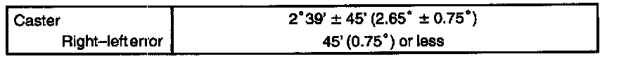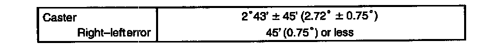If the caster and steering axis inclination are not within the specified values, after the camber has been correctly adjusted, recheck the suspension parts for damaged and/or worn out parts.
