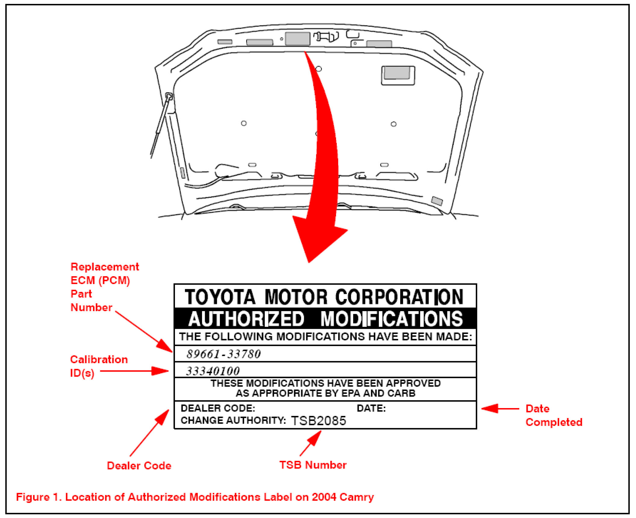 1. Check for the Authorized Modifications Label affixed to the vehicle in the location shown in Figure 1. Confirm if the ECM (PCM) calibration has been updated. If the calibration listed is NOT the latest ECM (PCM) calibration - go to step 2.