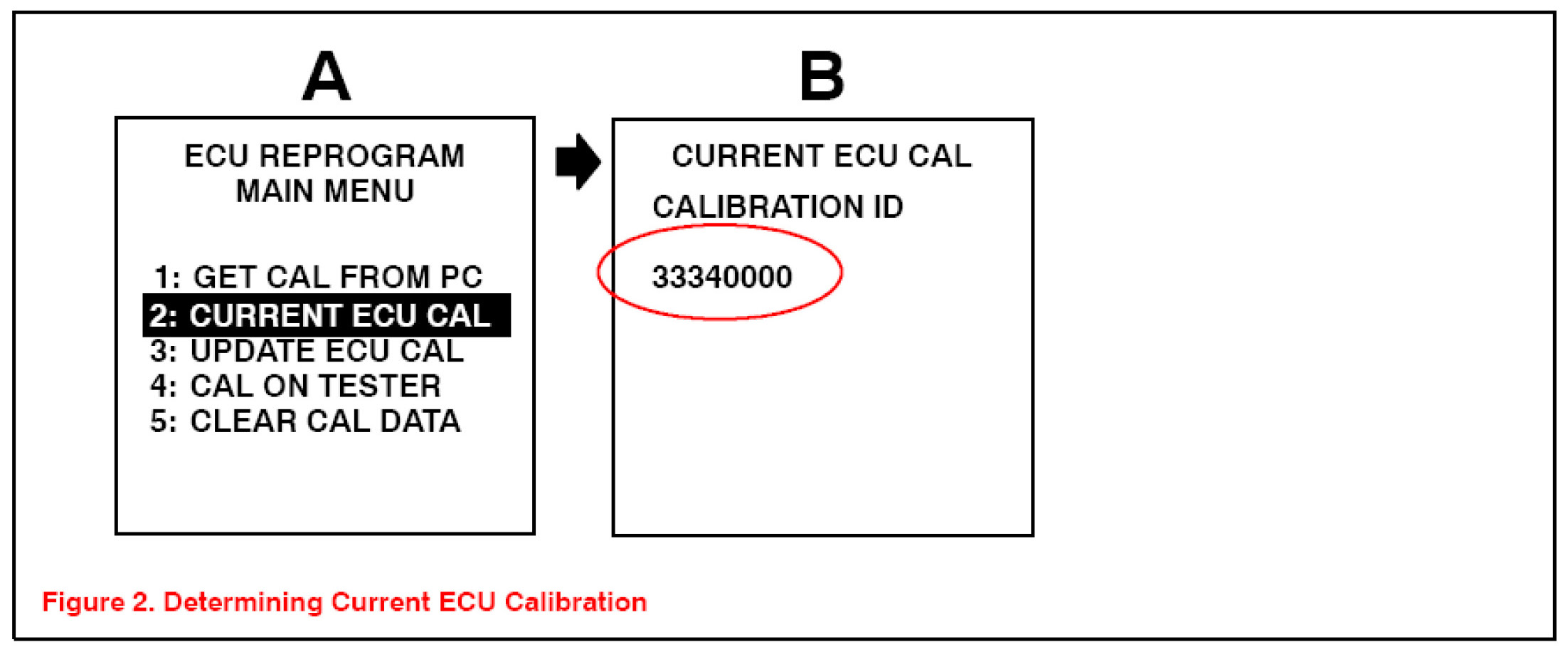 2. Connect the Diagnostic Tester to the vehicle's DLC3 connector and select CURRENT ECU CAL from the ECU REPROGRAM MAIN MENU. Determine the vehicle's current ECU calibration (see Figure 2).