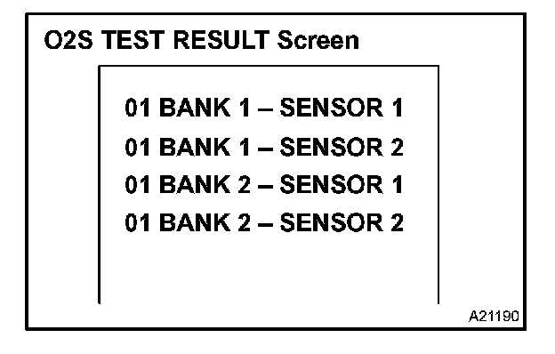 b. On the tester screen, select the following menus: DIAGNOSIS/ CARB OBD II/O2S TEST RESULT. A list of the O2S equipped on the vehicle will be displayed.