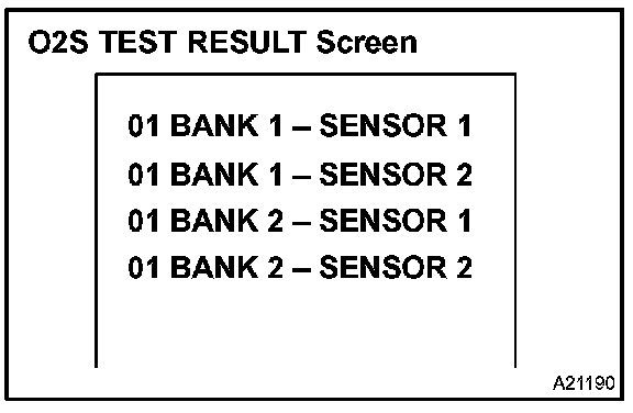 b. On the tester screen, select the following menus: DIAGNOSIS/ CARB OBD II/O2S TEST RESULT. A list of the O2S equipped on the vehicle will be displayed.