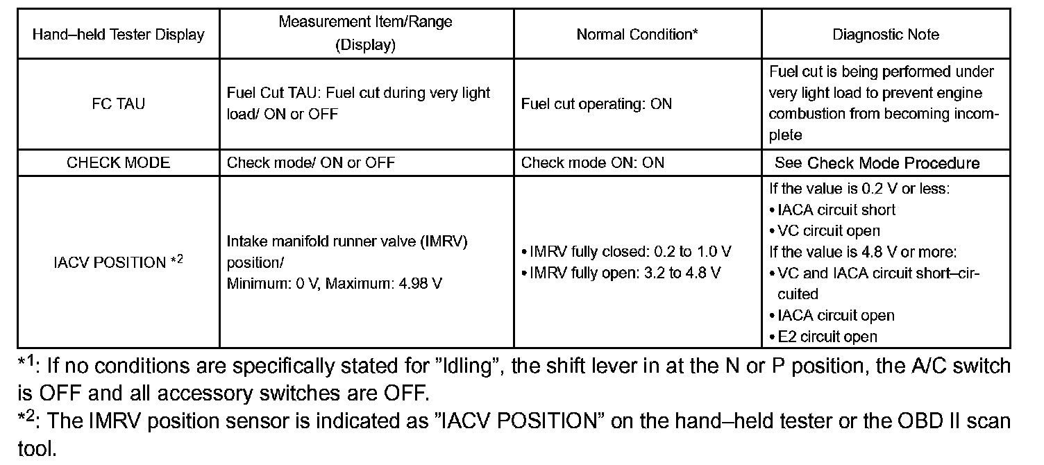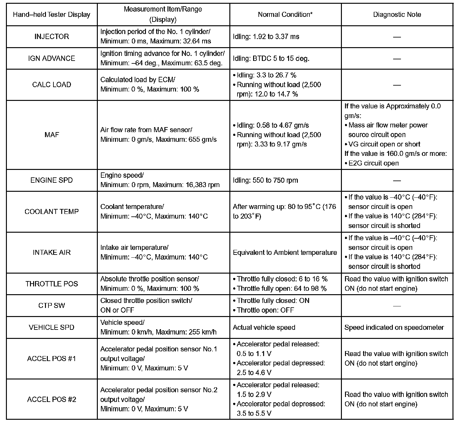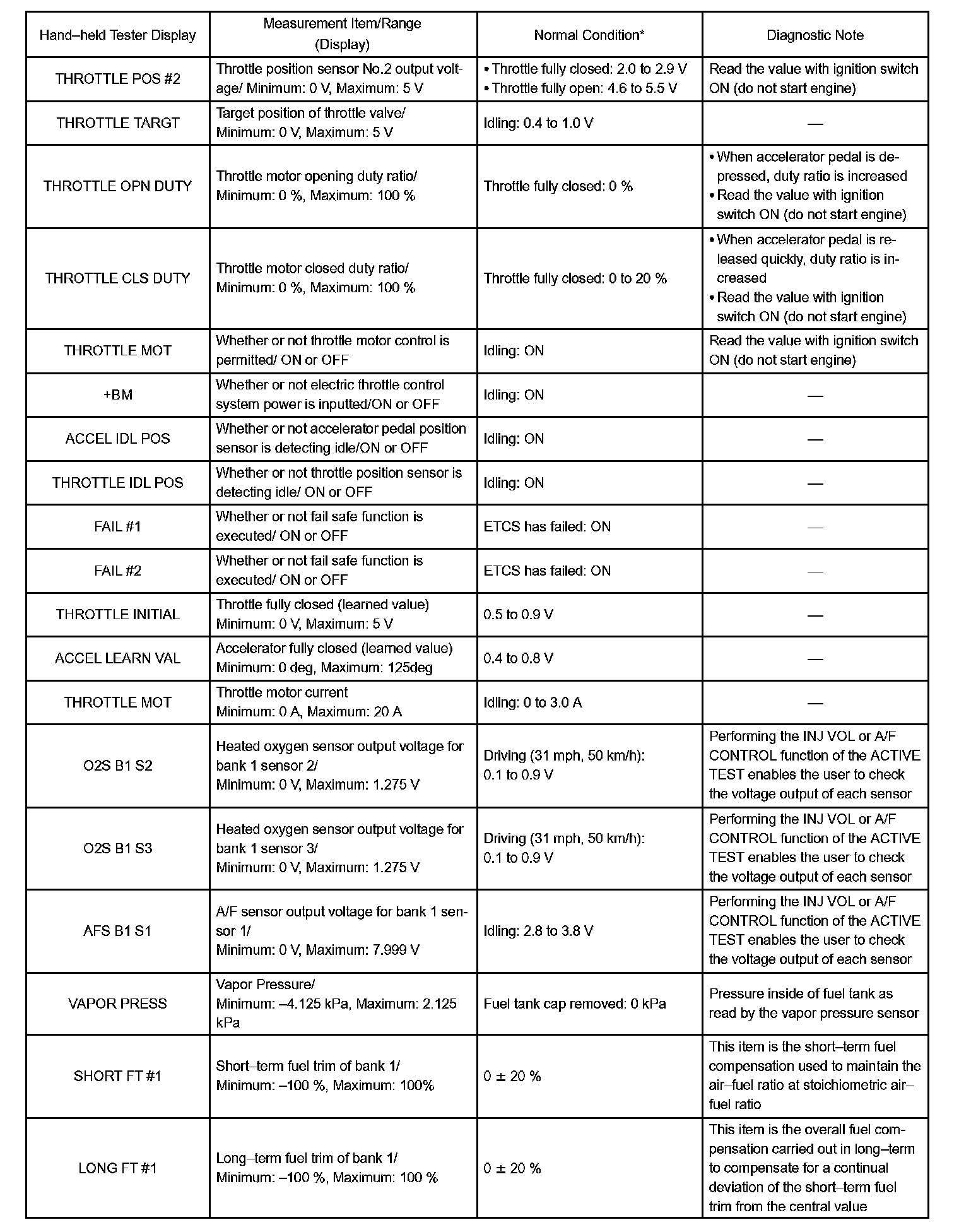 DATA LISTHINT: Using the hand-held tester DATA LIST allows switch, sensor, actuator and other item values to be read without removing any parts. Reading the DATA LIST early in troubleshooting is one way to shorten labor time.