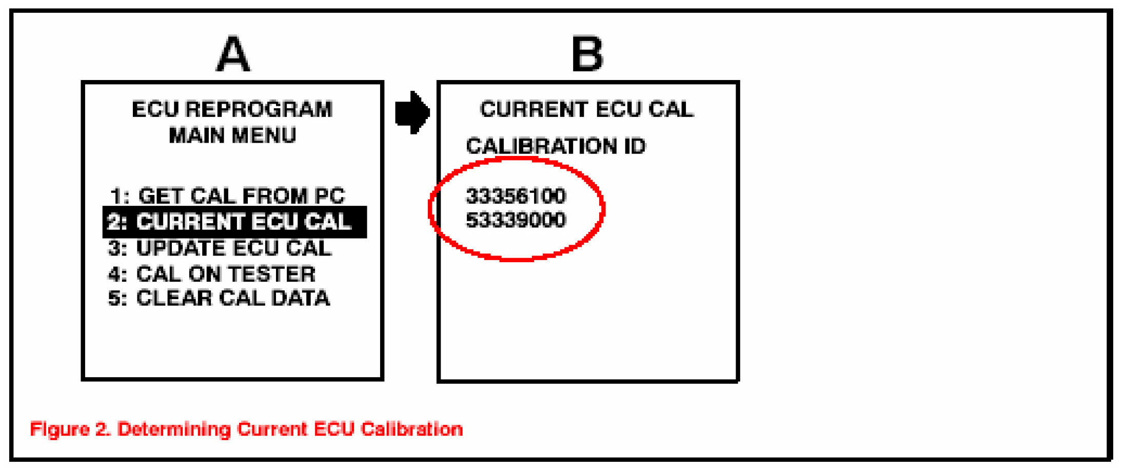 2. Connect the Diagnostic Tester to the vehicle and select CURRENT ECU CAL from the ECU REPROGRAM MAIN MENU. Determine the vehicle's current ECU calibration (see Figure 2).