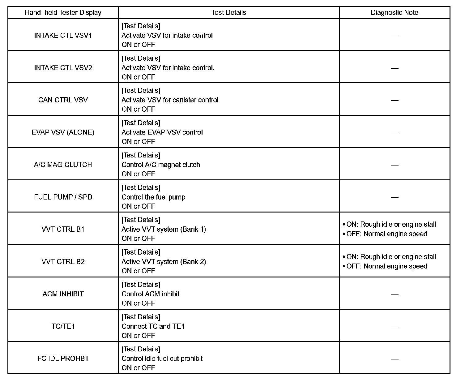 ACTIVE TESTHINT: Performing the hand-held tester ACTIVE TEST allows relay, VSV, actuator and other items to be operated without removing any parts. Performing the ACTIVE TEST early in troubleshooting is one way to shorten labor time. The DATA LIST can be displayed during the ACTIVE TEST.