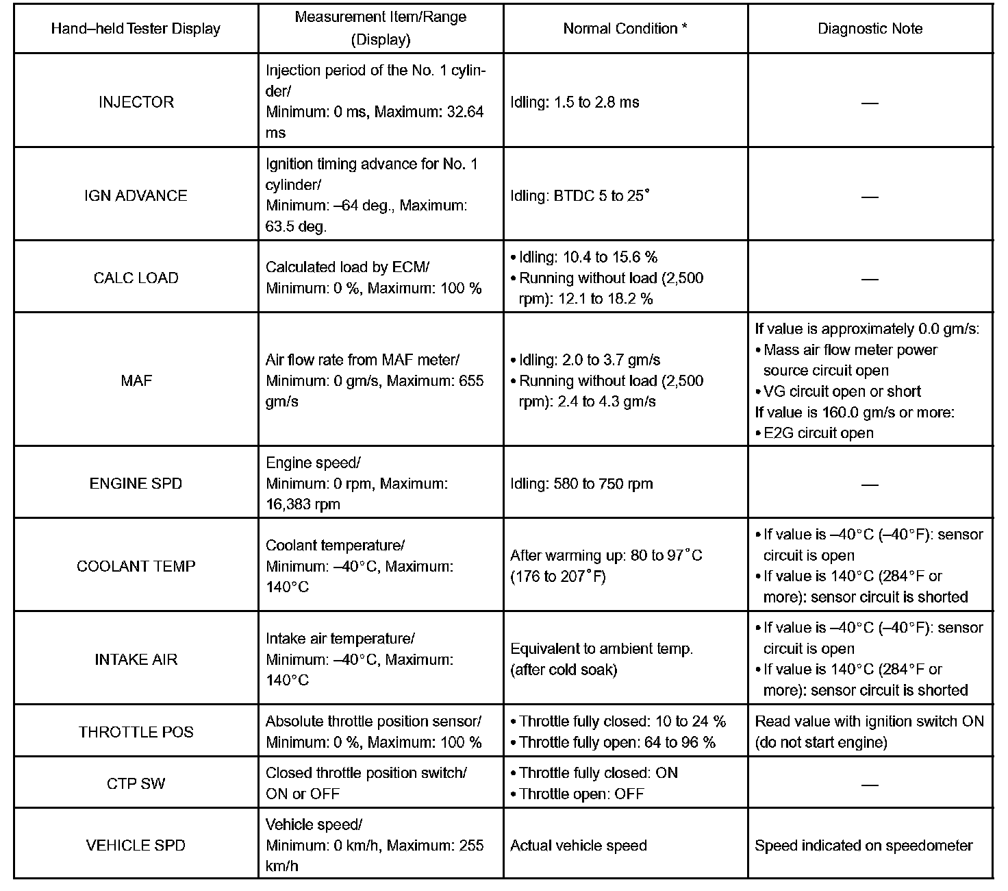 DATA LISTHINT: Using the hand-held tester DATA LIST allows switch, sensor, actuator and other item values to be read without removing any parts. Reading the DATA LIST early in troubleshooting is one way to shorten labor time.