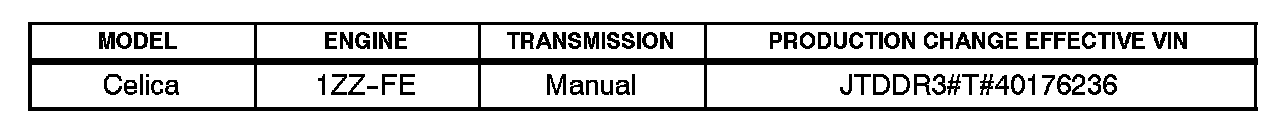 ^ 2003 - 2004 model year Celica vehicles equipped with 1ZZ-FE engine and manual transmission produced BEFORE the Production Change Effective VIN shown below.