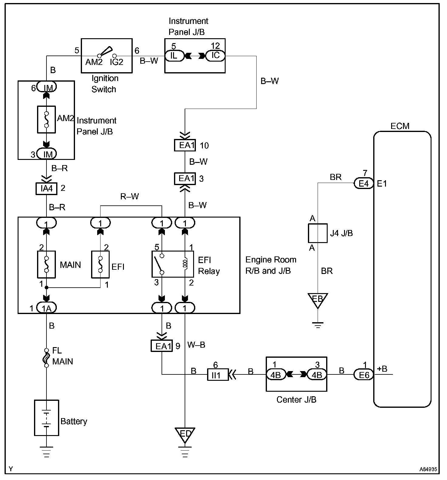 When the ignition switch is turned ON, battery positive voltage is applied to the coil which closes the contacts of the EFI main relay (Marked: EFI) and supplies power to terminal +B of the ECM.