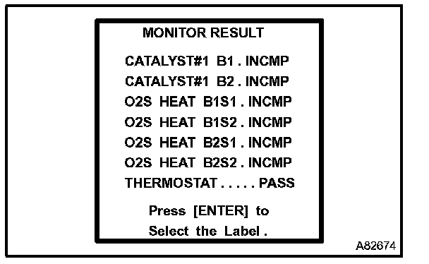 b. Enter "MONITOR RESULT" from "DIAGNOSIS / ENHANCED OBD II / MONITOR INFO / MONITOR RESULT" on the hand-held tester. You will see "Test ID" and "INCMP", "Pass" or "Fail" on the MONITOR RESULT screen.