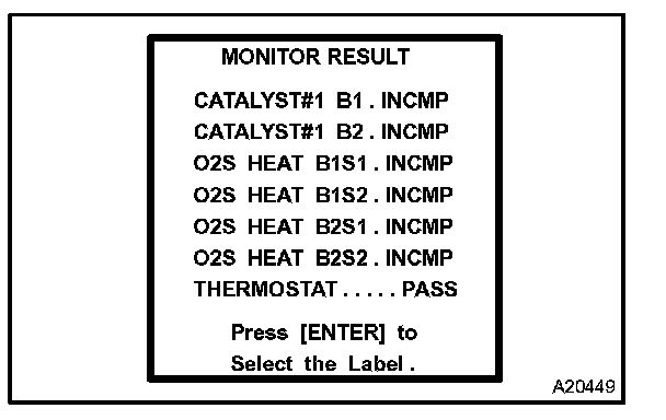 2. Enter "MONITOR RESULT" from "DIAGNOSIS / ENHANCED OBD II / MONITOR INFO / MONITOR RESULT" on the hand-held tester. You will see "Test ID" and "INCMP", "Pass" or "Fail" on the MONITOR RESULT screen.