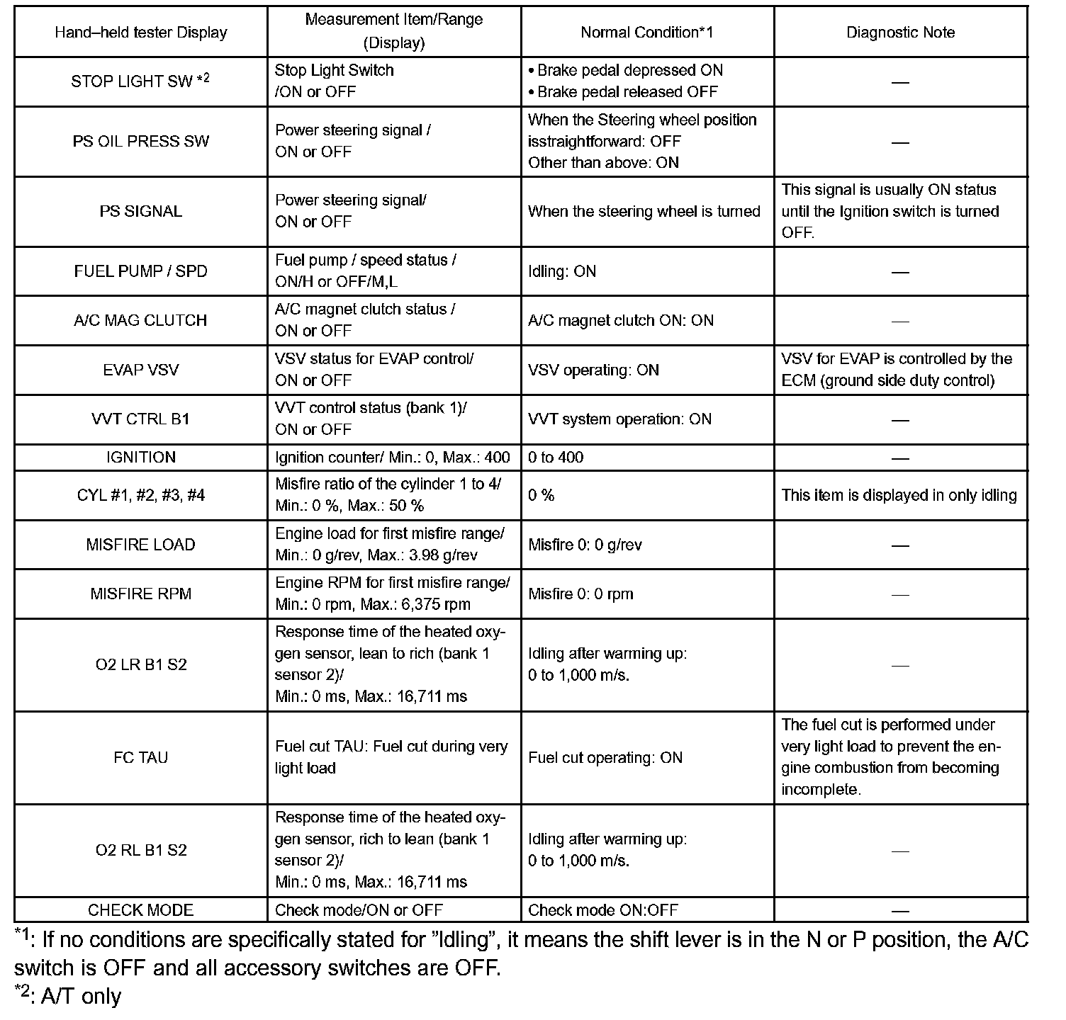HINT: Using the DATA LIST displayed by the hand-held tester or the OBD II scan tool, you can read the value of the switches, sensors, actuators and so on without parts removal. Reading the DATA LIST as a first step of troubleshooting is one method to shorten diagnostic time.