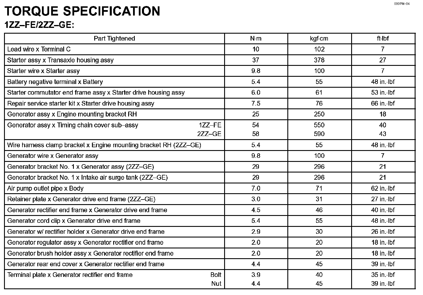 Starting & Charging - Torque Specification: