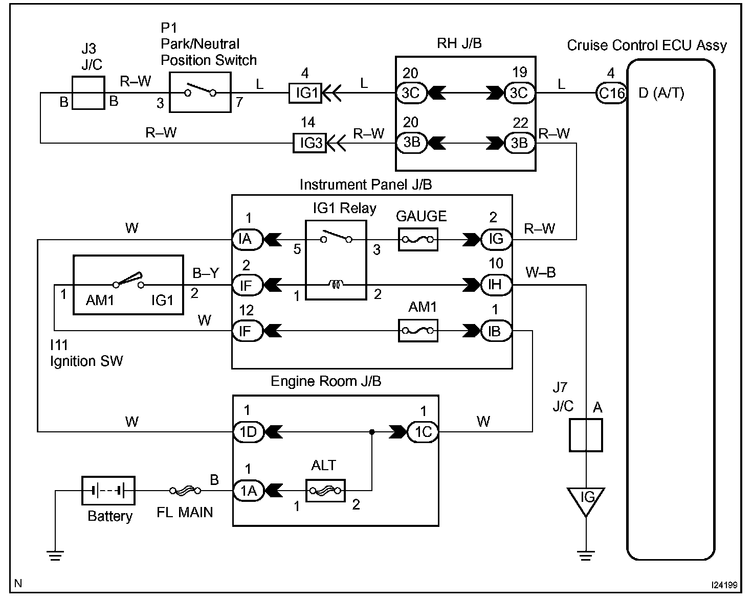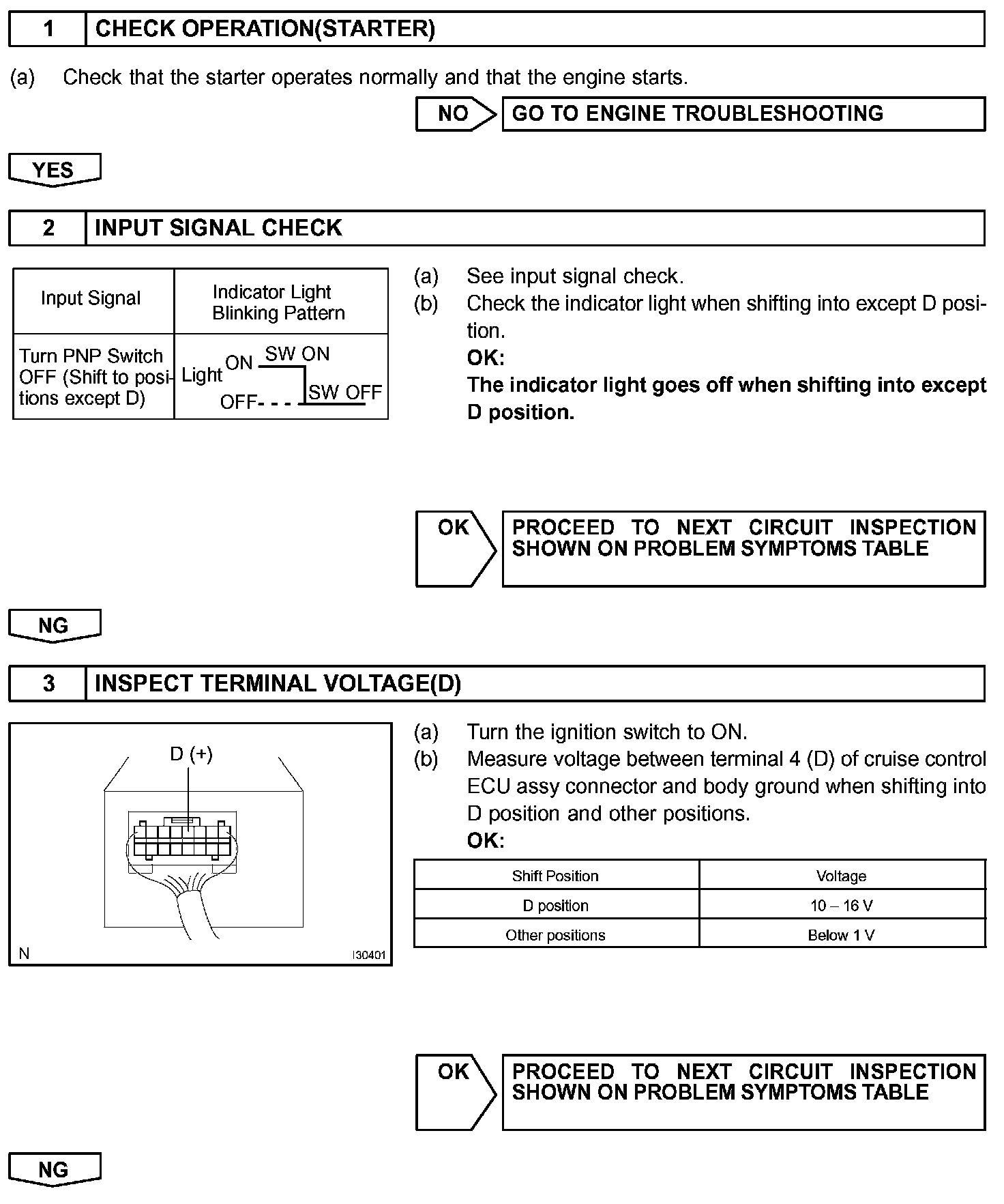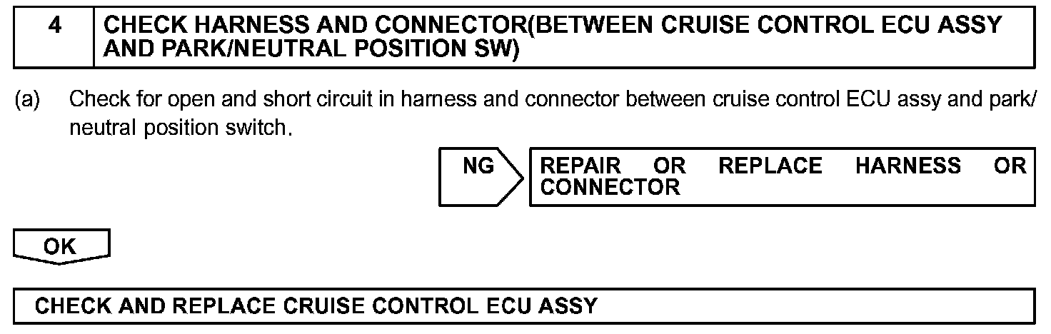 When the shift position is put in except D position, a signal is sent from the park/neutral position switch to the cruise control ECU assy. When this signal is input during cruise control driving, the ECU cancels the cruise control.
