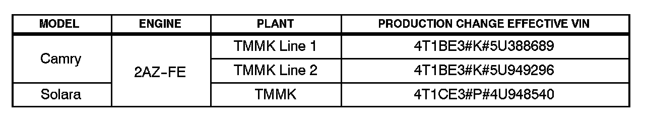 ^ 2003 - 2004 model year Camry and Solara vehicles equipped with 2AZ-FE engine produced BEFORE the Production Change Effective VINs shown below.