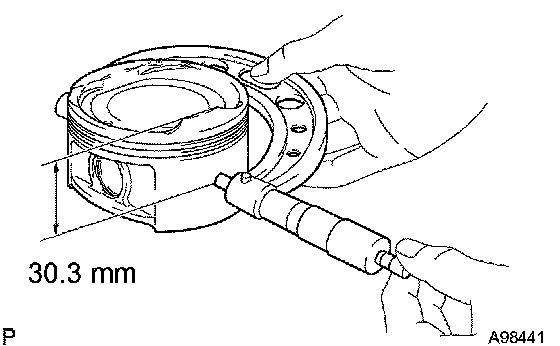 Using a micrometer, measure the piston diameter at right angles to the piston pin center line, 30.3 mm (1.193 inch) from the piston head.