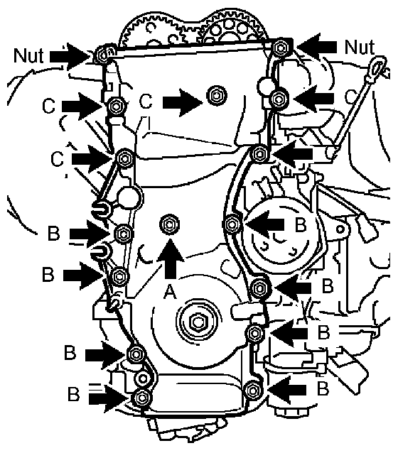 Install the timing chain cover with the 14 bolts and 2 nuts.