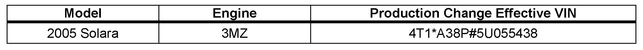 - 2005 model year Solara vehicles equipped with 3MZ-FE engine produced BEFORE the Production Change Effective VINs shown below.