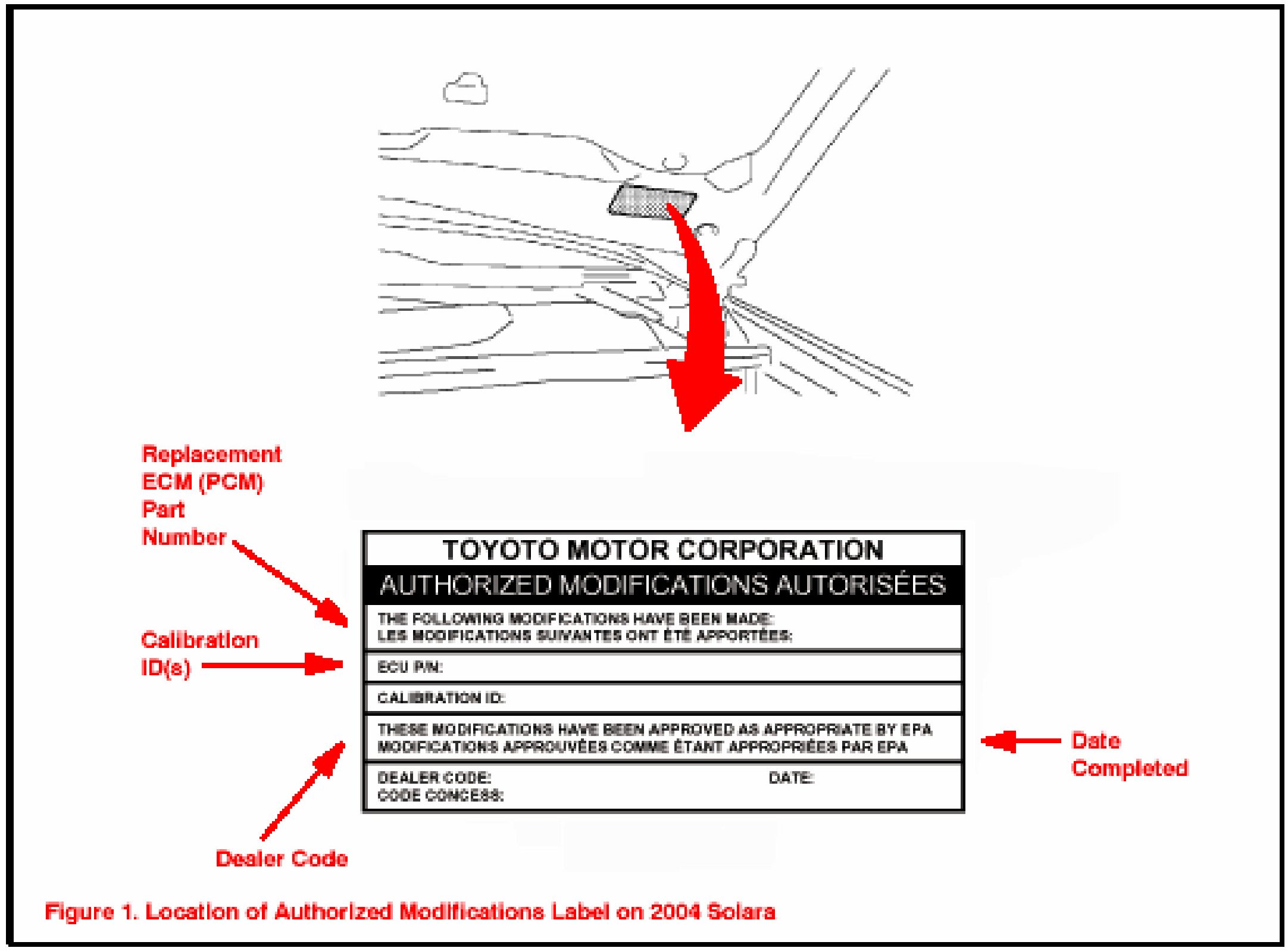 2. Check for the Authorized Modifications Label affixed to the vehicle in the location shown in Figure 1. Confirm if ECM (PCM) calibration has been updated. If not latest ECM (PCM) calibration - go to step 3.