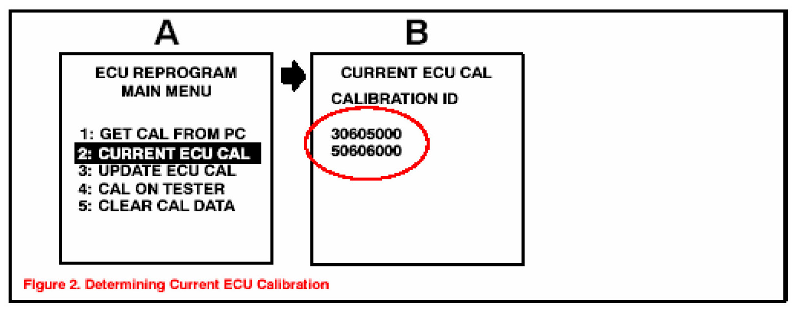 3. Connect the Diagnostic Tester to the vehicle and select CURRENT ECU CAL from the ECU REPROGRAM MAIN MENU. Determine the vehicle's current ECU calibration (see Figure 2).