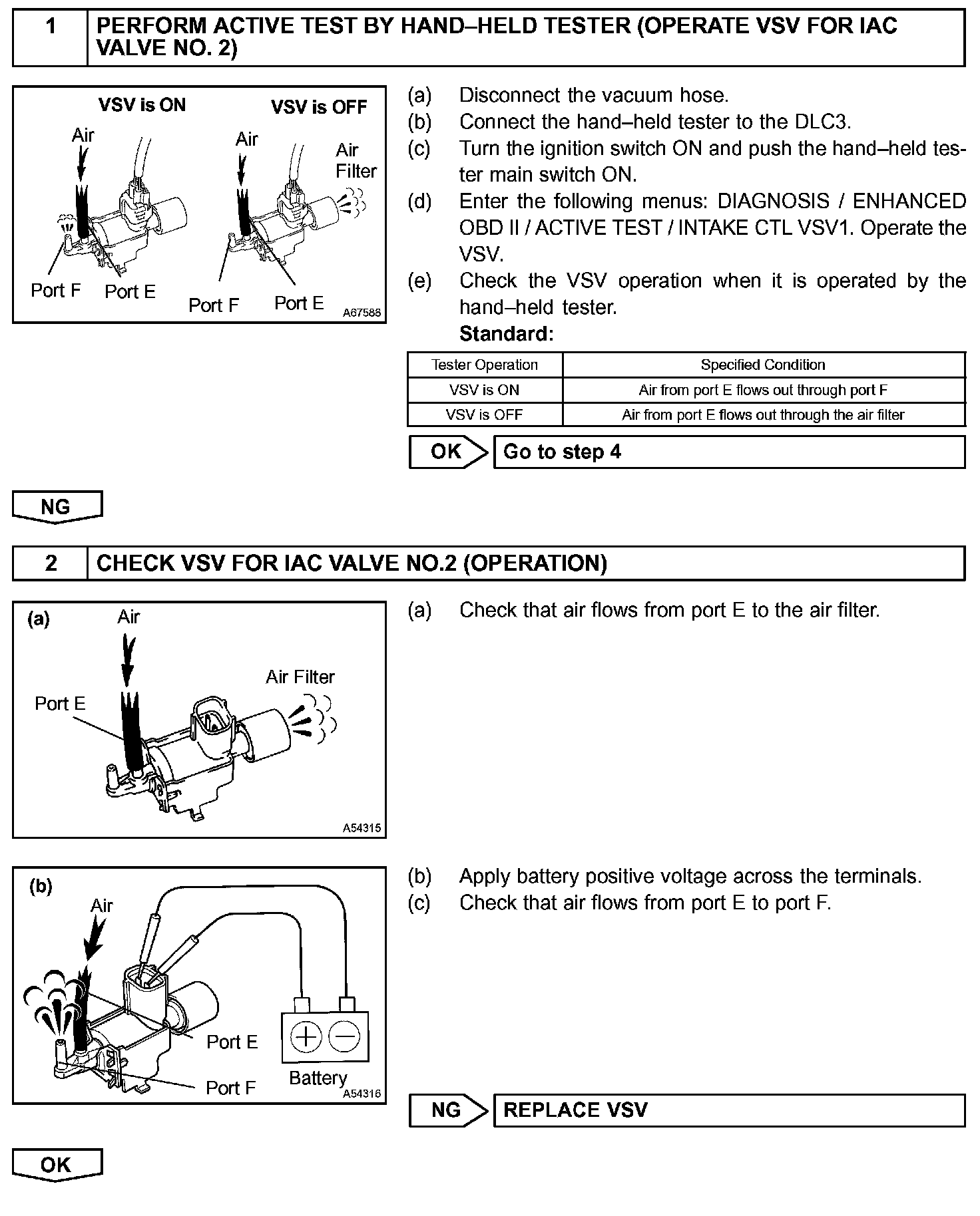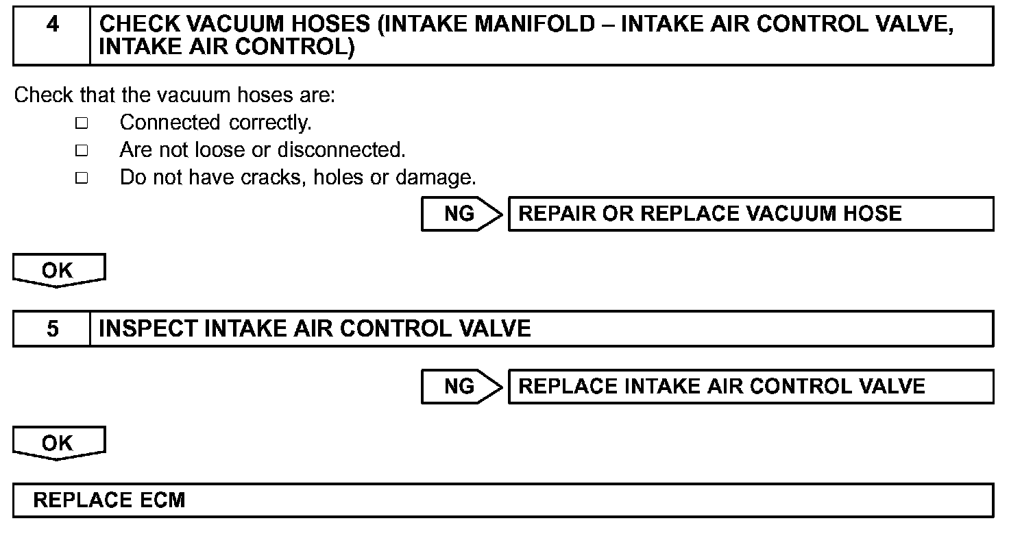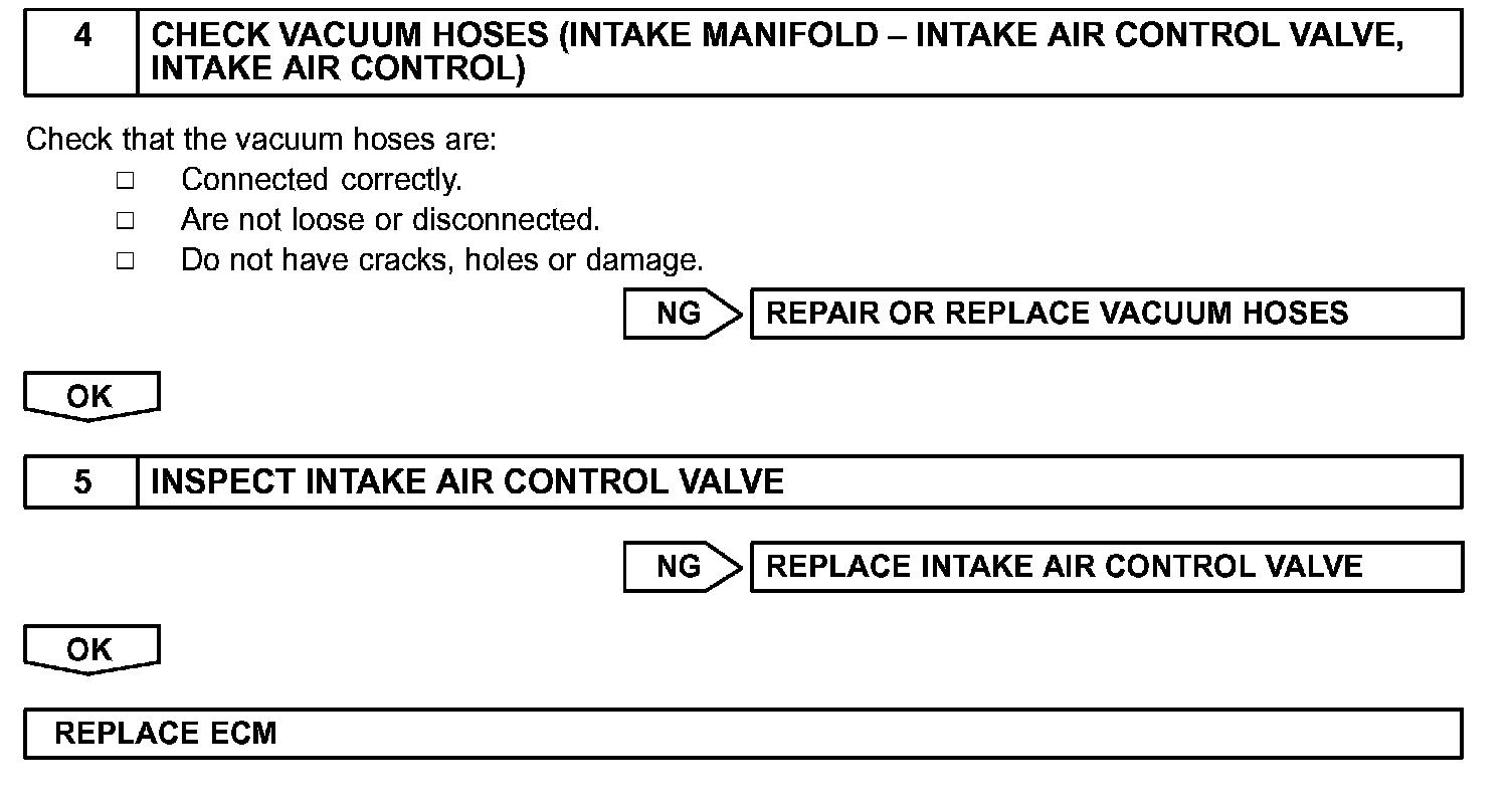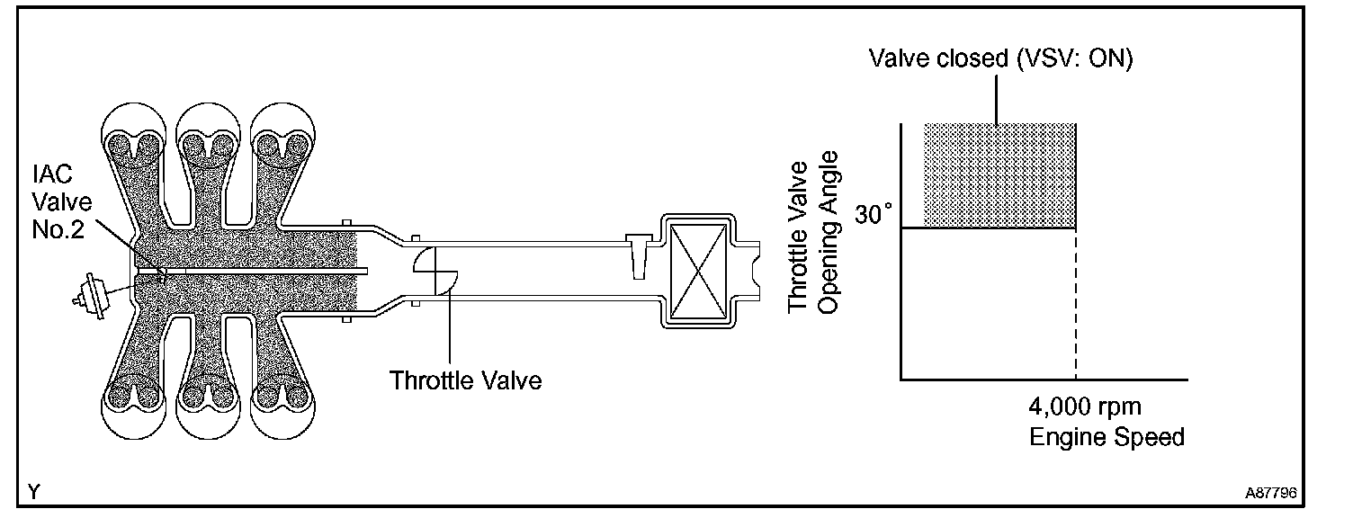 The ECM opens and closes the Intake Air Control (IAC) valve No.2 in response to engine speed (RPM/NE). This system improves intake manifold tuning for better efficiency at low and high engine rpm. When the engine speed is 4,000 rpm or less and the throttle valve opening angle is 30° or more, the ECM turns the VSV ON to operate the IAC valve.