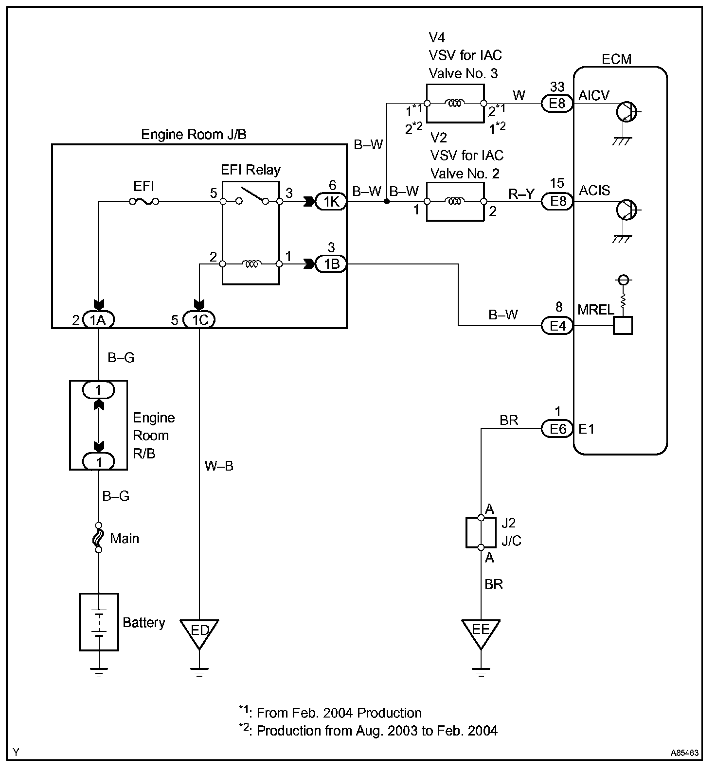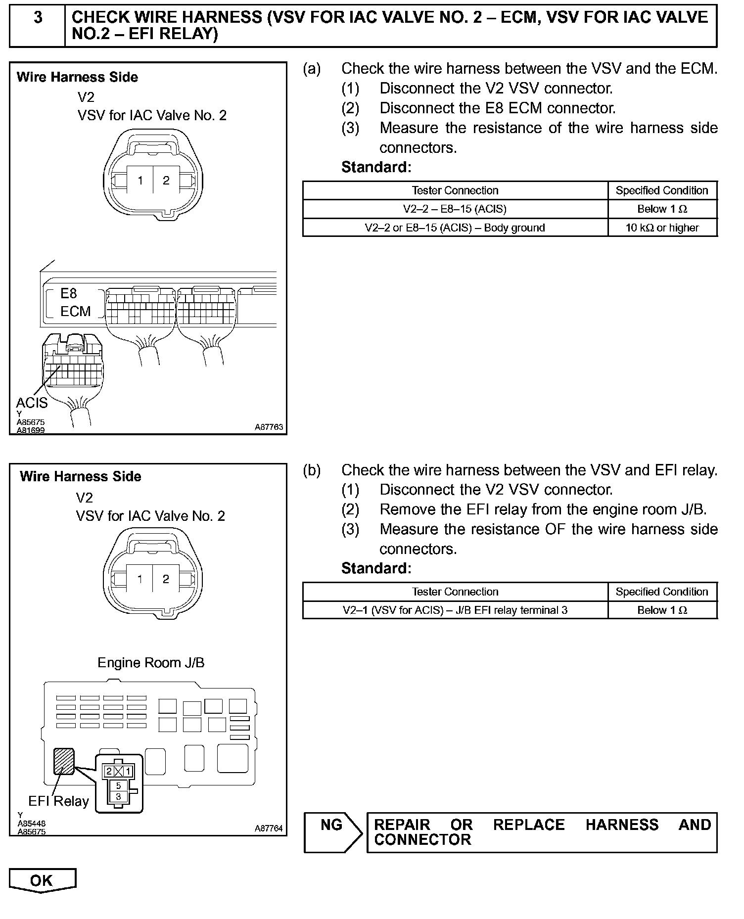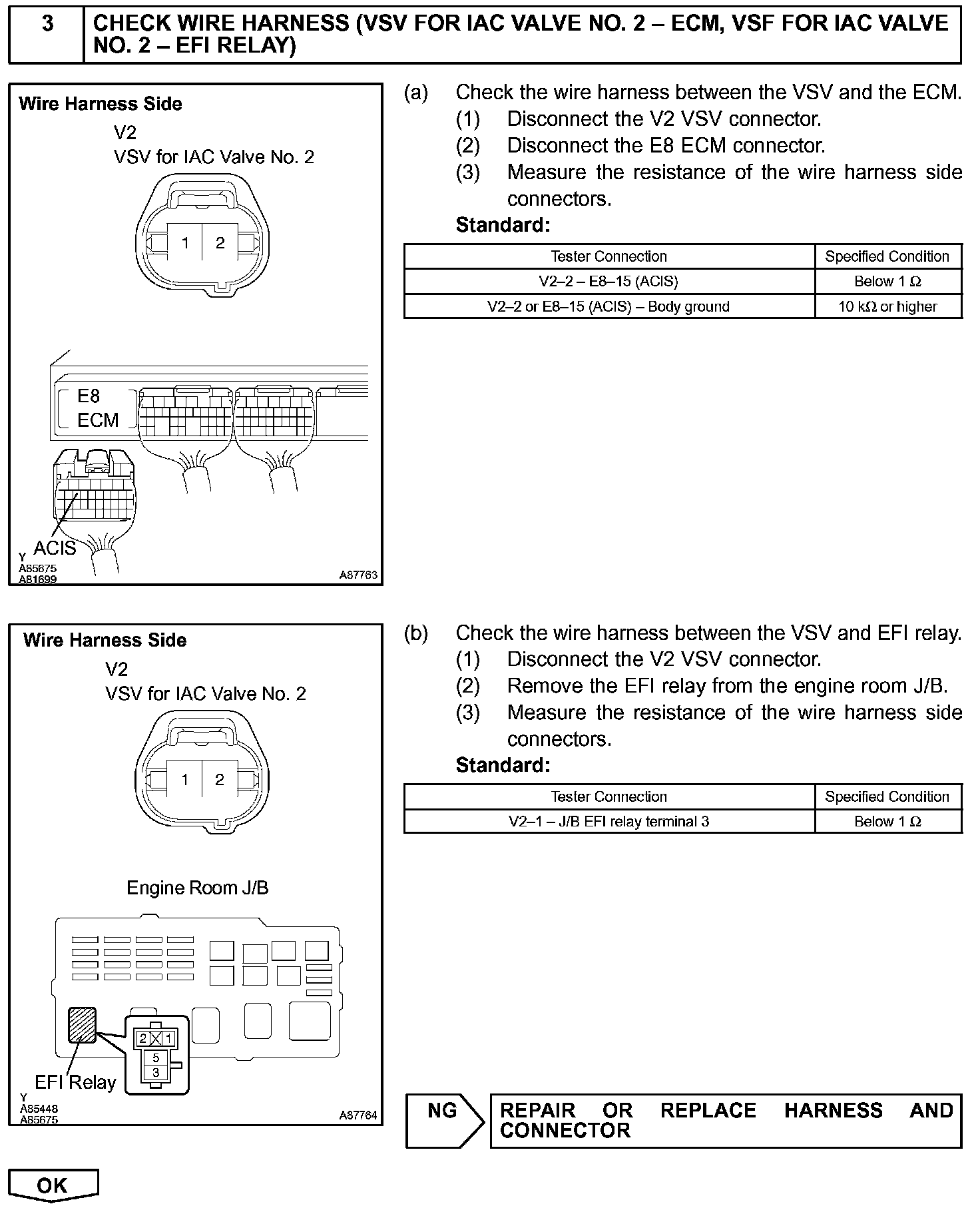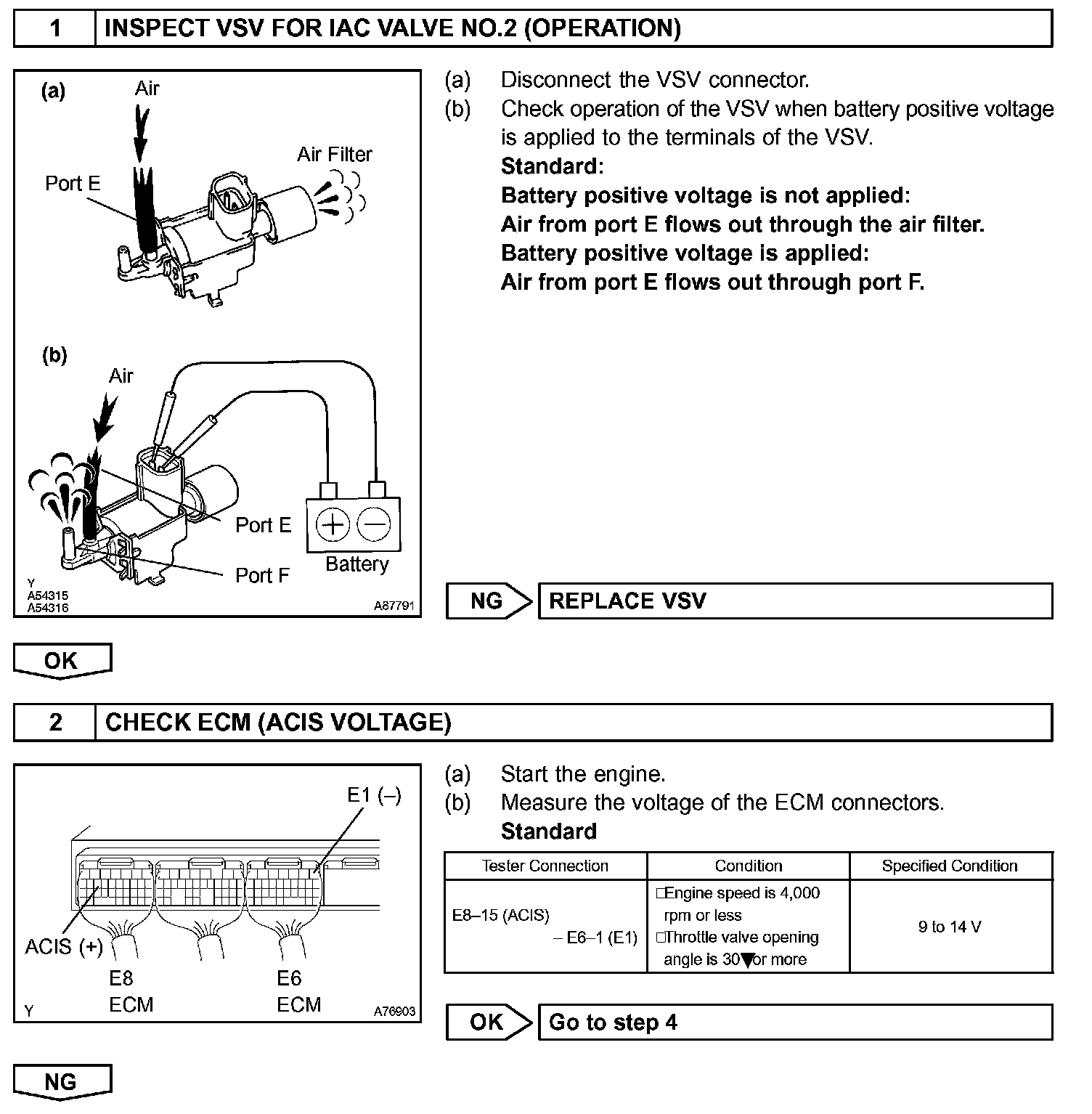 The ECM opens and closes the Intake Air Control (IAC) valve No.2 in response to engine speed (RPM/NE). This system improves intake manifold tuning for better efficiency at low and high engine rpm. When the engine speed is 4,000 rpm or less and the throttle valve opening angle is 30° or more, the ECM turns the VSV ON to operate the IAC valve.