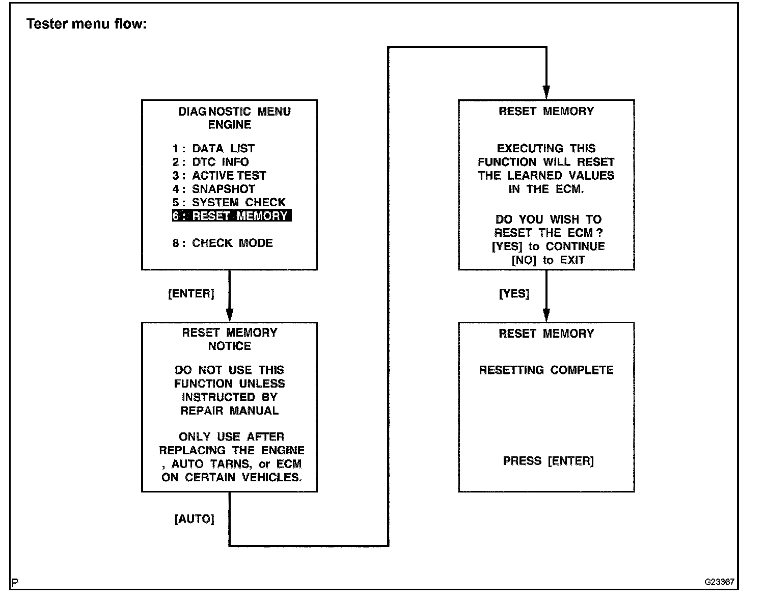 HINT: The ECM memorizes the condition that the ECT controls the automatic transaxle assy and engine assy according to those characteristics. Therefore, when the automatic transaxle assy, engine assy, or ECM has been replaced, it is necessary to reset the memory so that the ECM can memorize the new information.