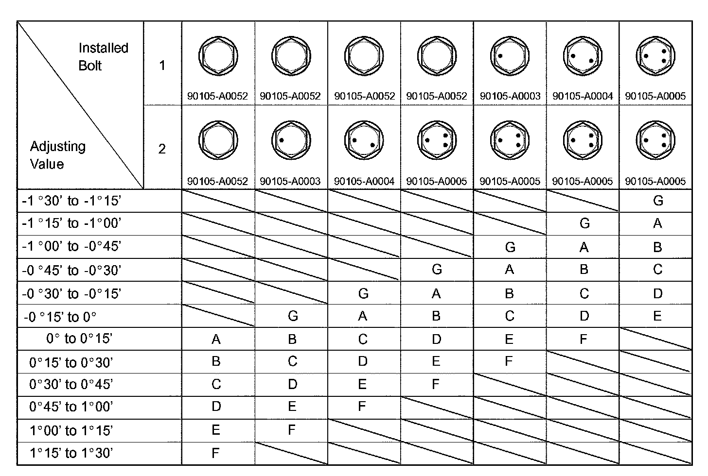 Check installed bolts combination. Select appropriate bolts from the table to adjust the camber to within the specified range.