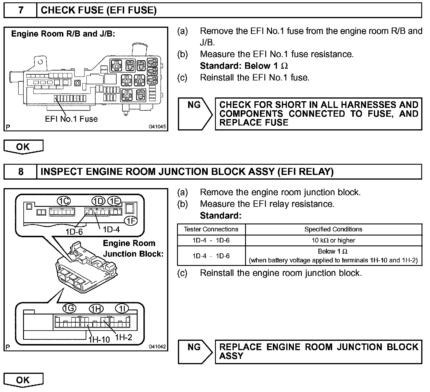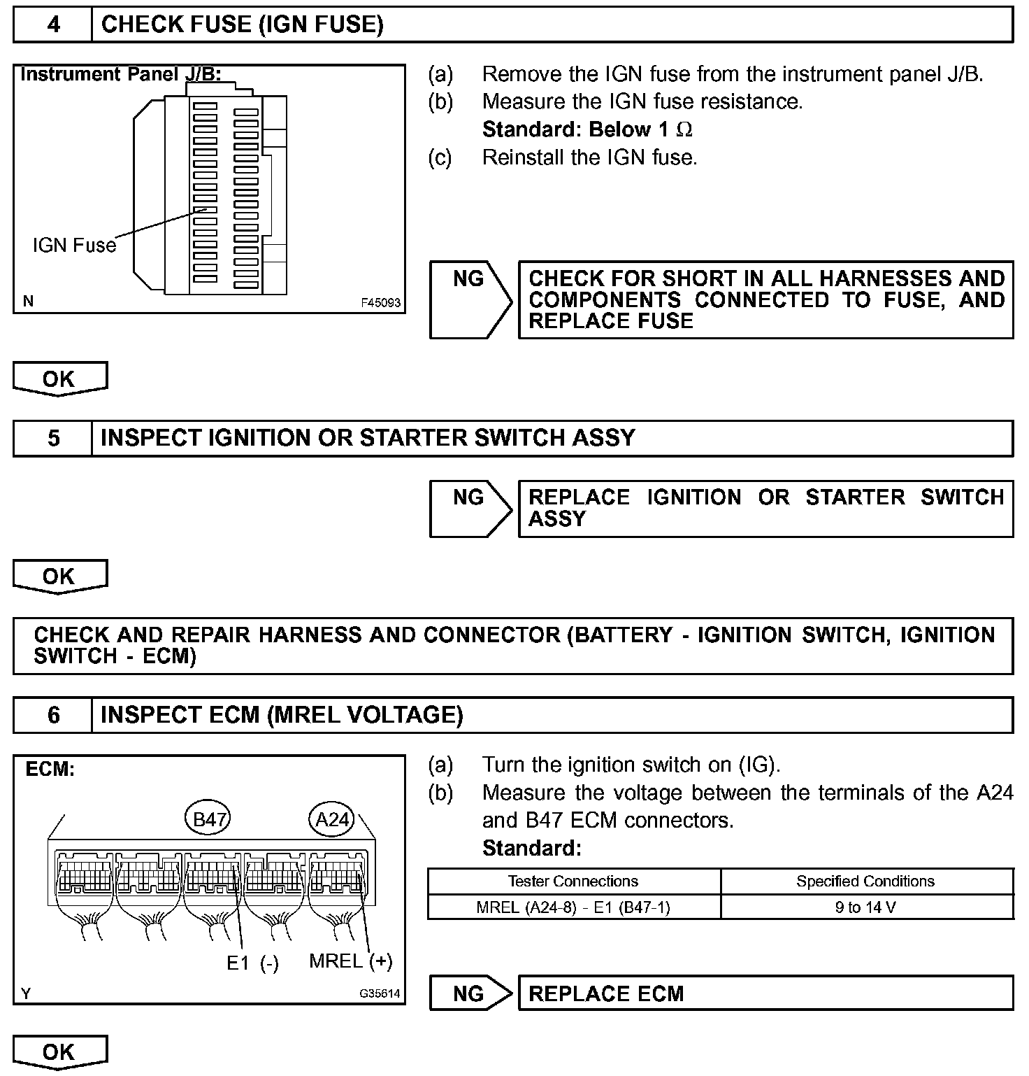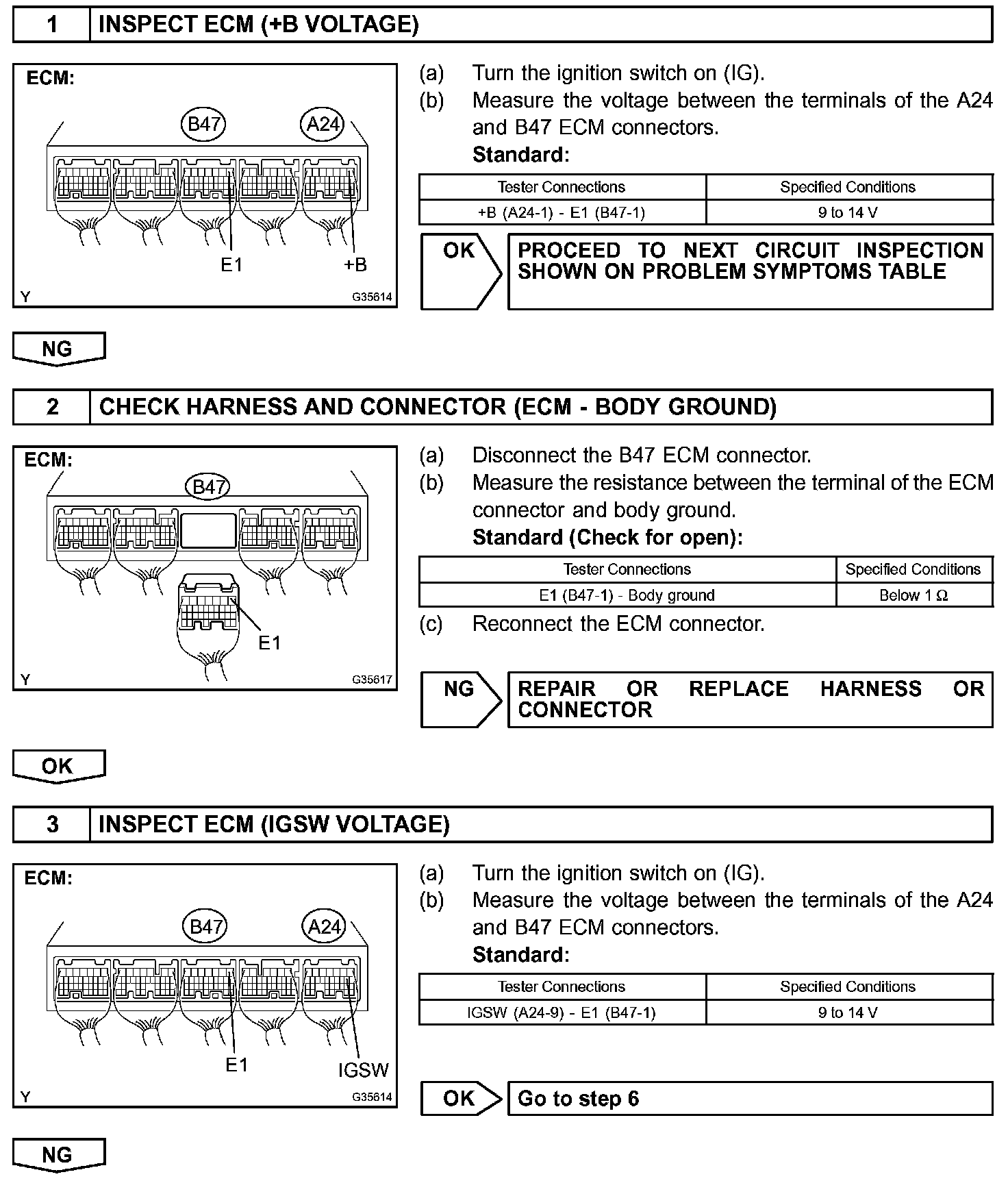 When the ignition switch is turned on (IG), the battery voltage is applied to terminal IGSW of the ECM. The ECM MREL output signal causes a current to flow to the coil, closing the contacts of the EFI relay and supplying power to terminal +B of the ECM.