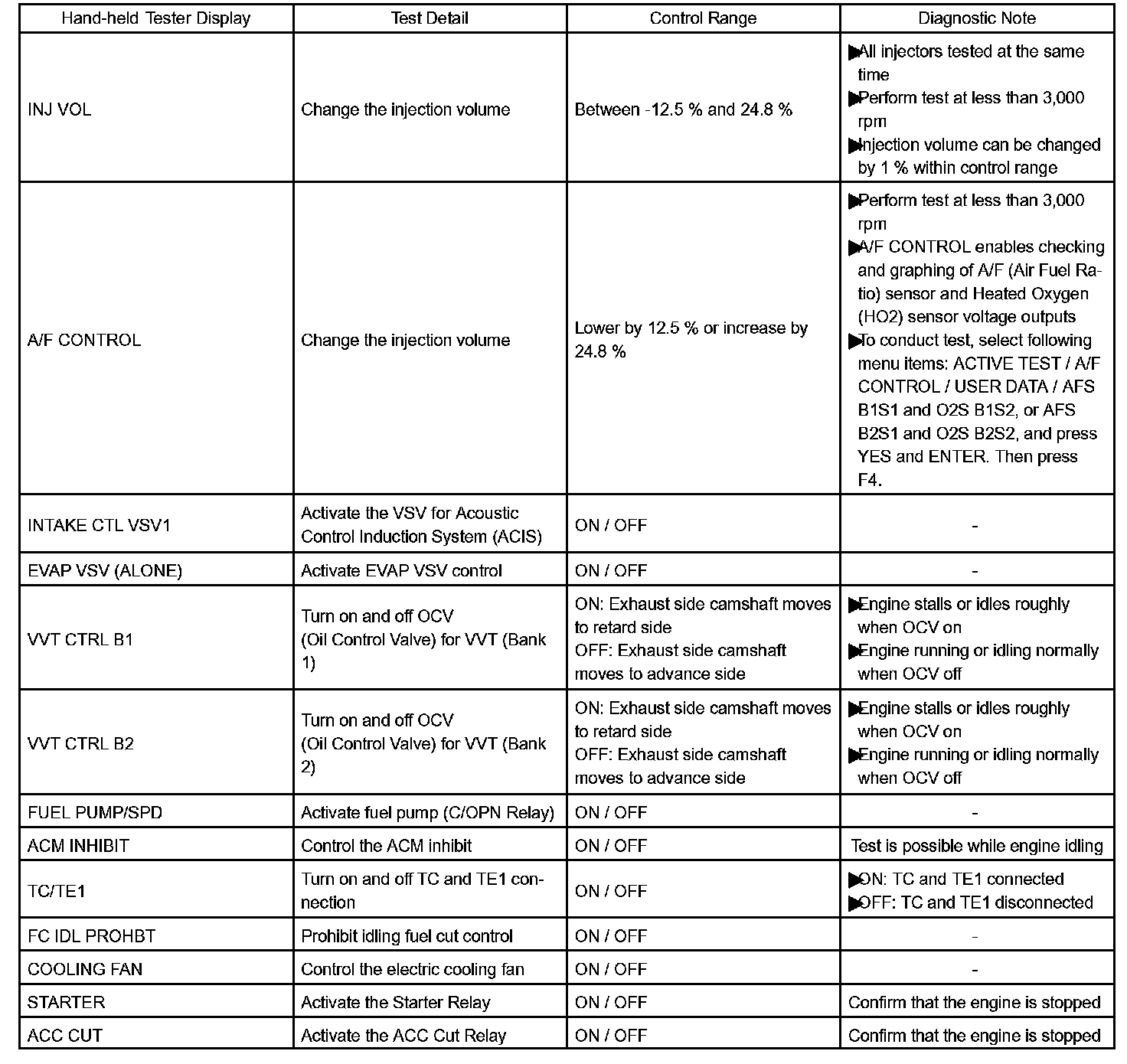 e. Perform the ACTIVE TEST by referring to the table.