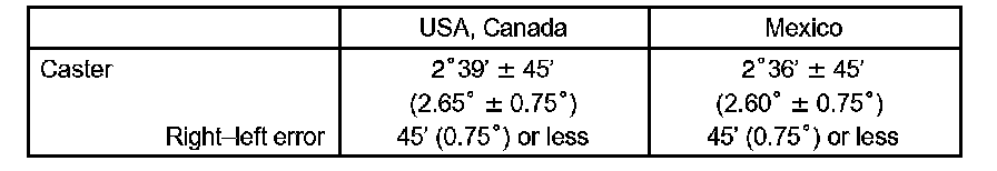 If the caster and steering axis inclination are not within the specified ranges, after the camber has been correctly adjusted, recheck the suspension parts for damaged and/or worn out parts.