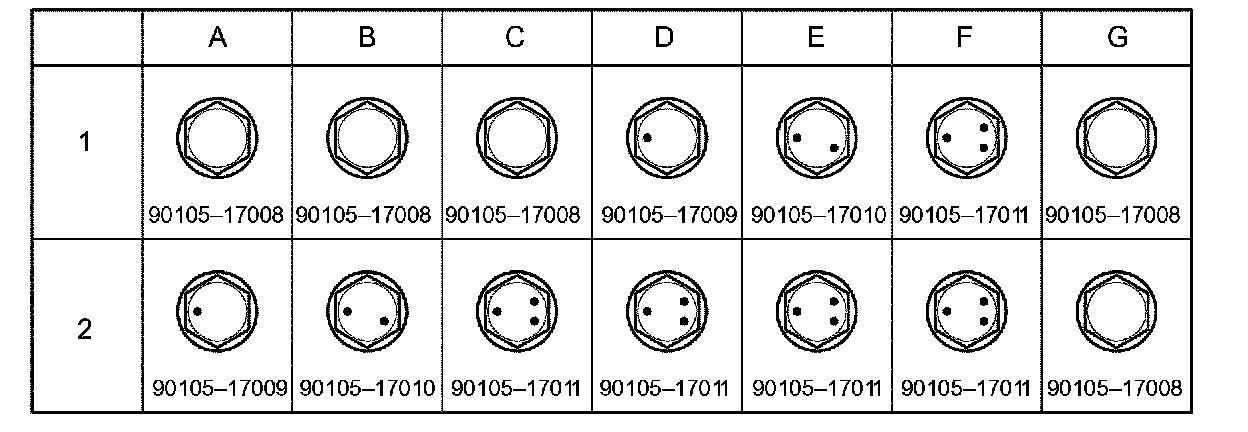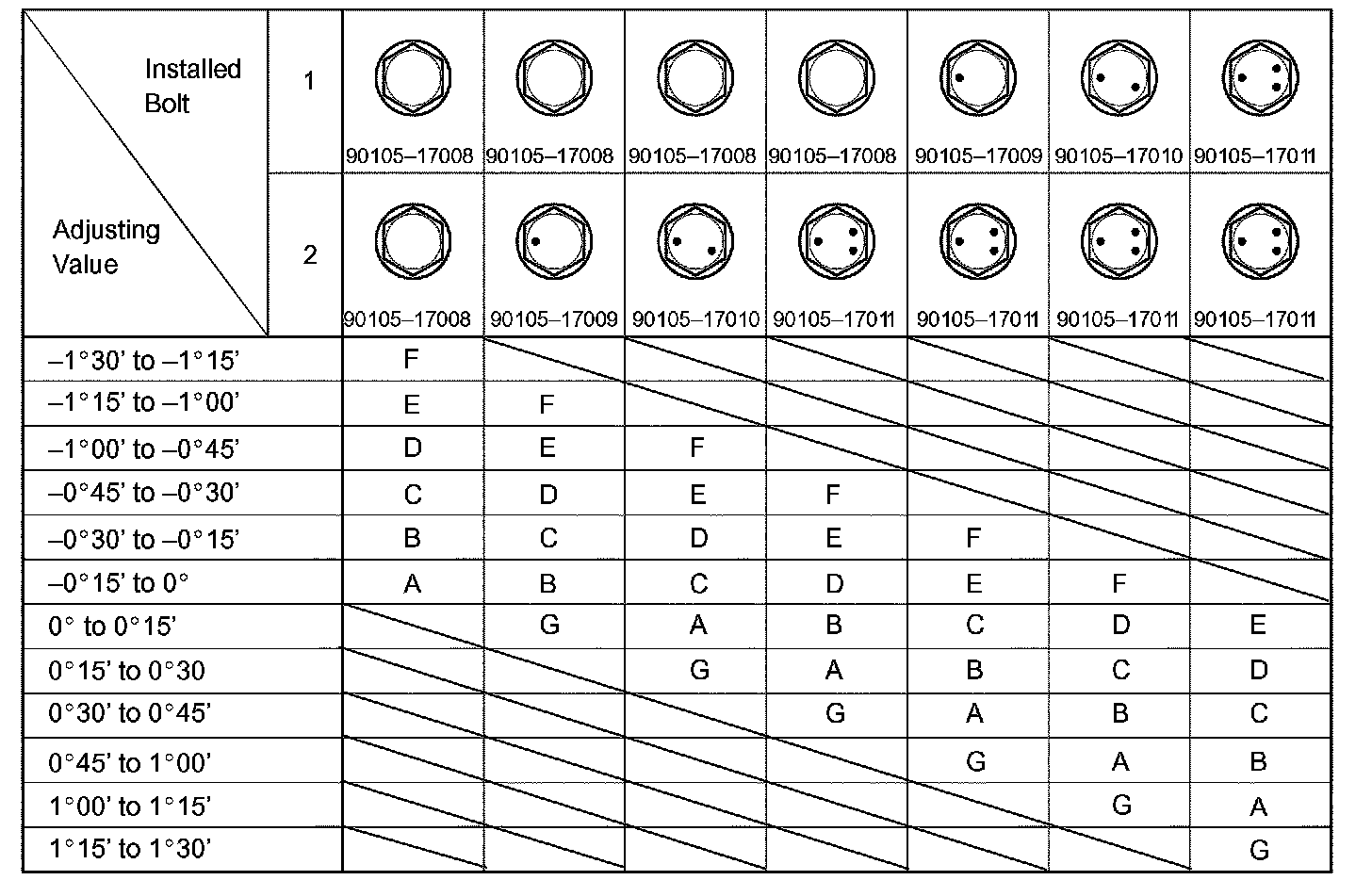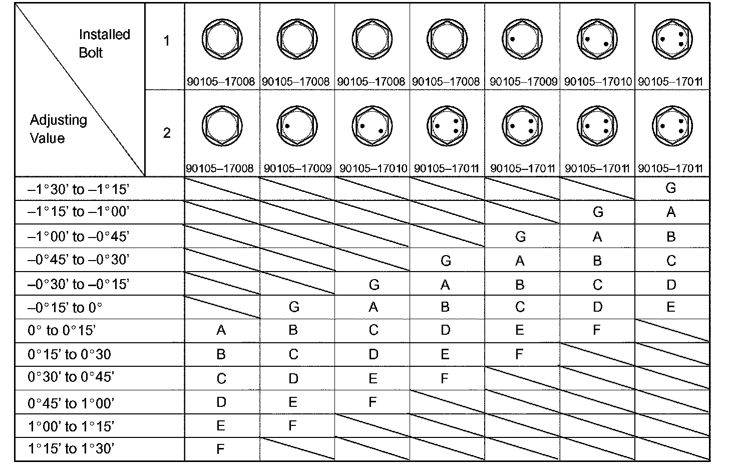 i. Check installed bolts combination. Select appropriate bolts from the table to adjust the camber within the specified range.