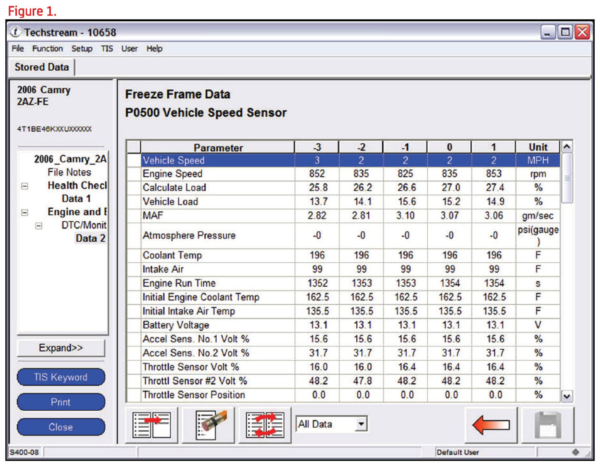 1. Inspect the Freeze Frame Data stored under "Engine and ECT" with the DTC P0500. (See Figure 1.)