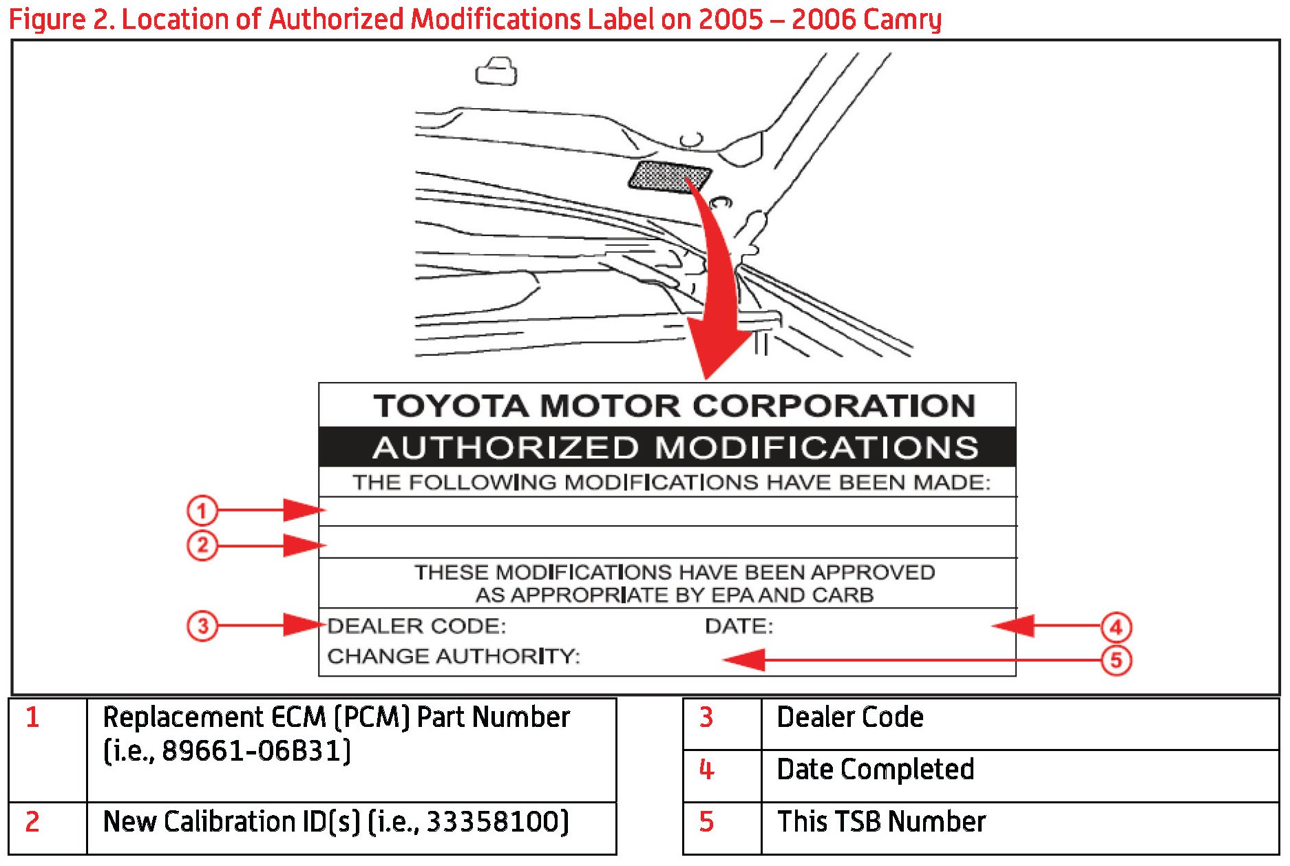 1. Check for the Authorized Modifications Label affixed to the vehicle in the location shown in Figure 2.Confirm if the ECM (PCM) calibration has been updated. If the calibration ID listed is NOT the latest ECM (PCM) calibration - go to step 2.
