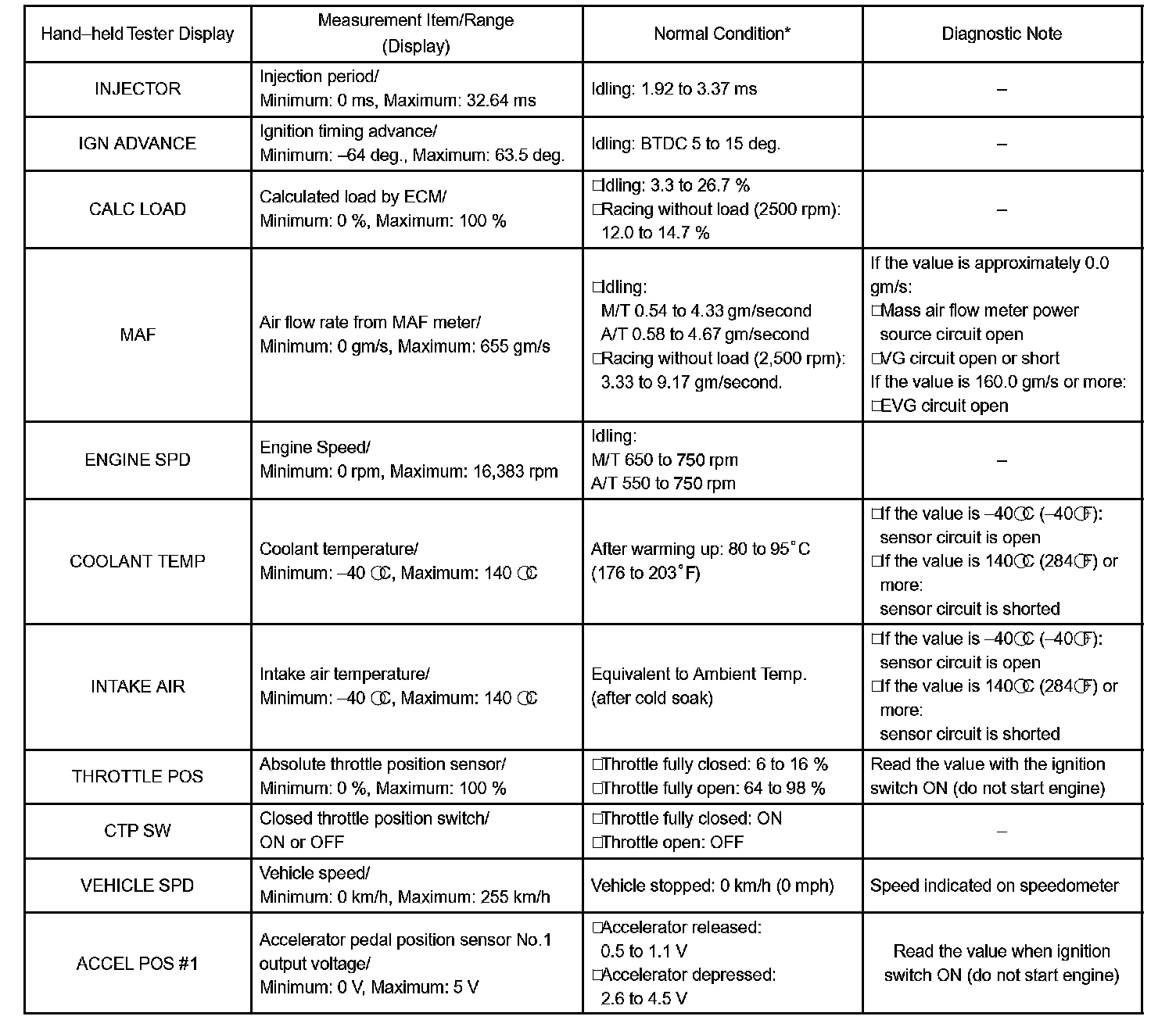 DATA LISTHINT: Using the hand-held tester DATA LIST allows switch, sensor, actuator and other item values to be read without removing any parts. Reading the DATA LIST early in troubleshooting is one way to shorten labor time.