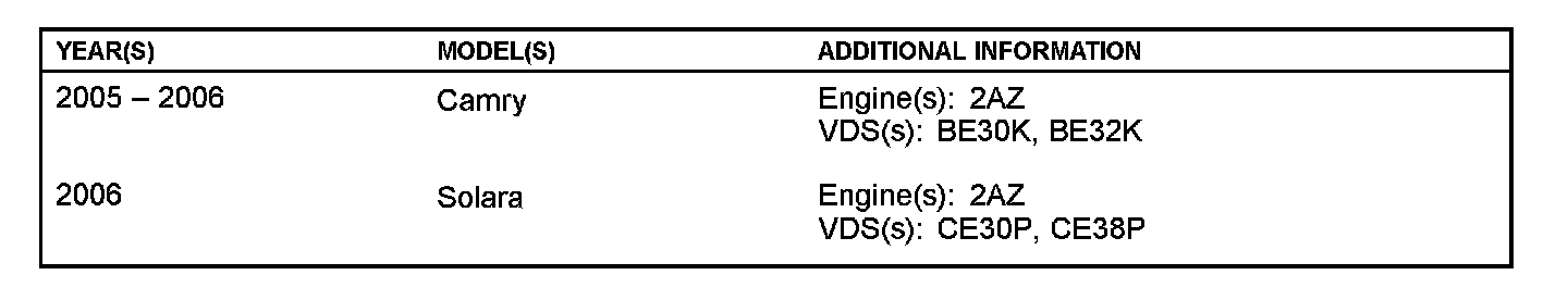Some 2005 - 2006 model year Camry and 2006 model year Solara vehicles may exhibit a MIL "ON" condition with Diagnostic Trouble Code (DTC) P0500 - Vehicle Speed Sensor "A". The Engine Control Module/ECM (SAE term: Powertrain Control Module/PCM) logic has been modified to reduce the possibility of this condition occurring. Use the following repair procedure to address this condition.