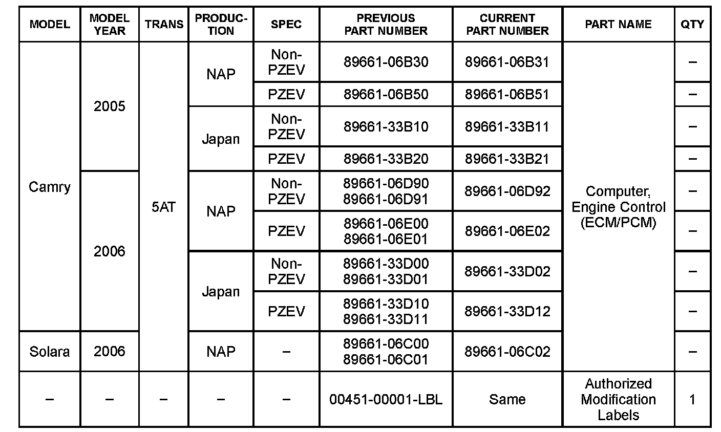 ^ For 2005 - 2006 Camry 4-cylinder models certified as PZEVs (Partial Zero Emission Vehicles) that are sold, registered, and operated in California, Connecticut, Maine, Massachusetts, New Hampshire, New Jersey, New York, Rhode Island, and Vermont, this repair is covered under the California Emissions Warranty. This warranty is in effect for 180 months or 150,000 miles, whichever occurs first, from the vehicle's in-service date.
