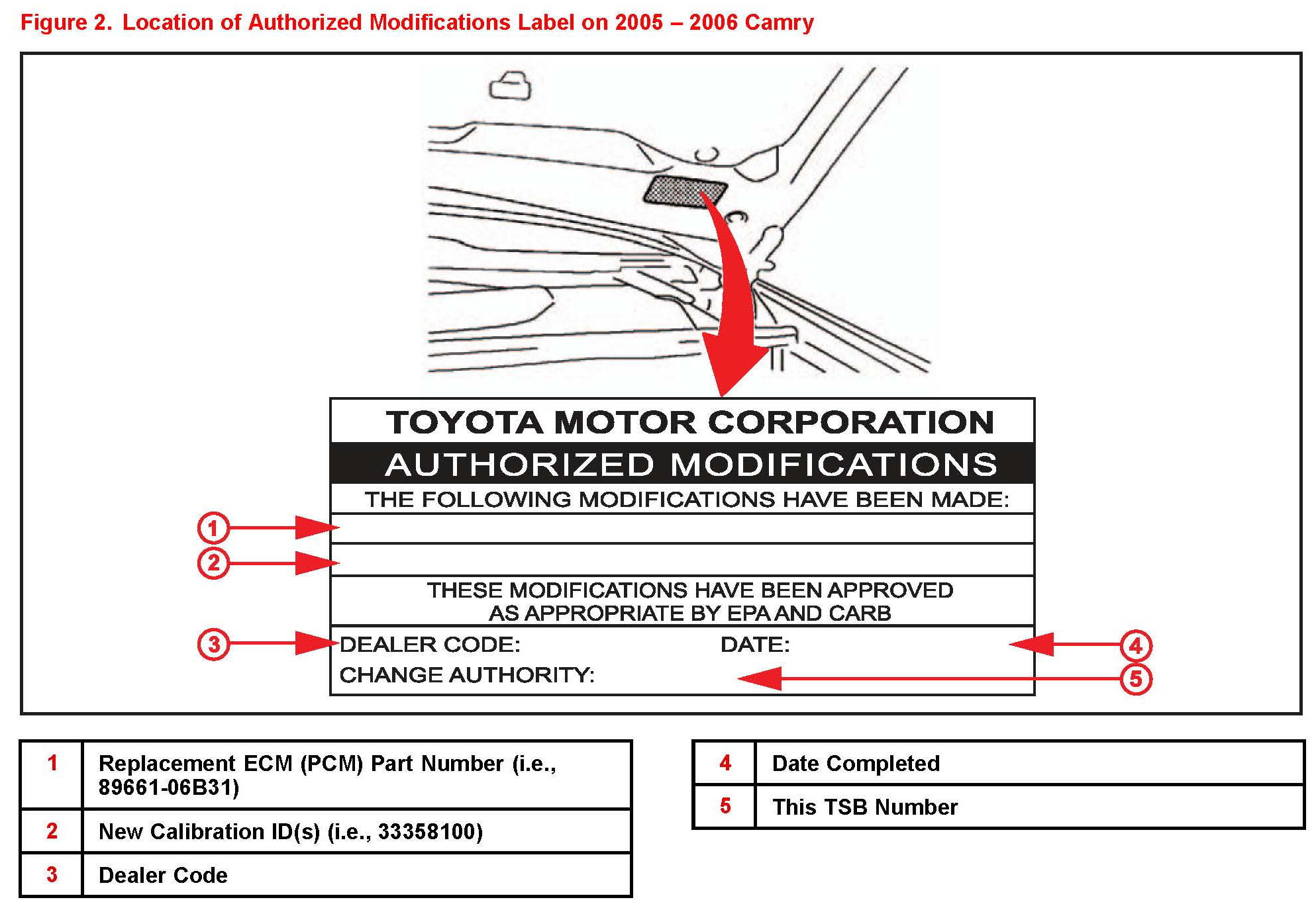 1. Check for the Authorized Modifications Label affixed to the vehicle in the location shown in Figure 2. Confirm if the ECM (PCM) calibration has been updated. If the calibration ID listed is NOT the latest ECM (PCM) calibration - go to step 2.