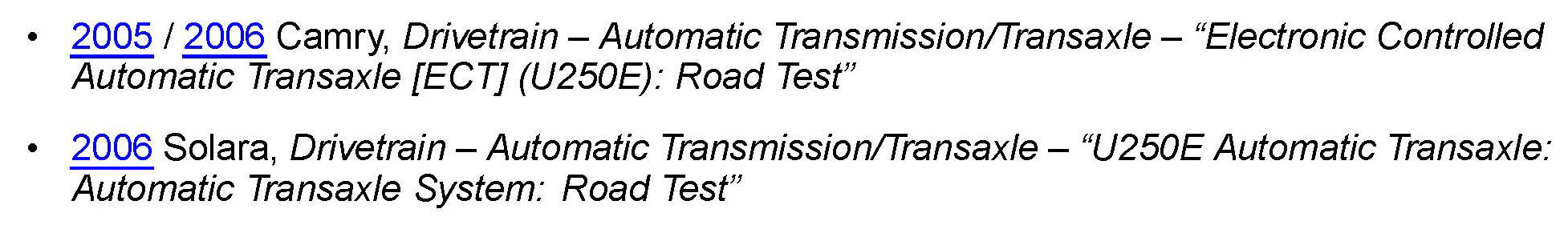 4. Test drive the vehicle to confirm proper vehicle operation and ECM (PCM) learning. Refer to TIS applicable model year Camry or Solara Repair Manual: