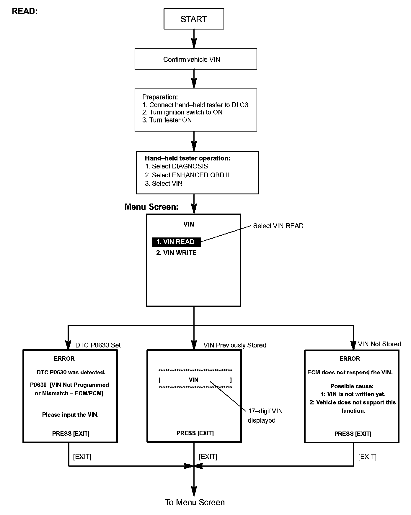 b. Read VIN: Explains the VIN reading process in a flowchart. This process allows the VIN stored in the ECM to be read, in order to confirm that the two VINs, provided with the vehicle and stored in the vehicle's ECM, are the same.