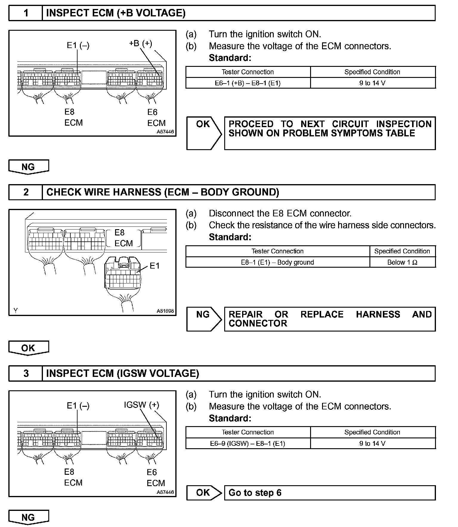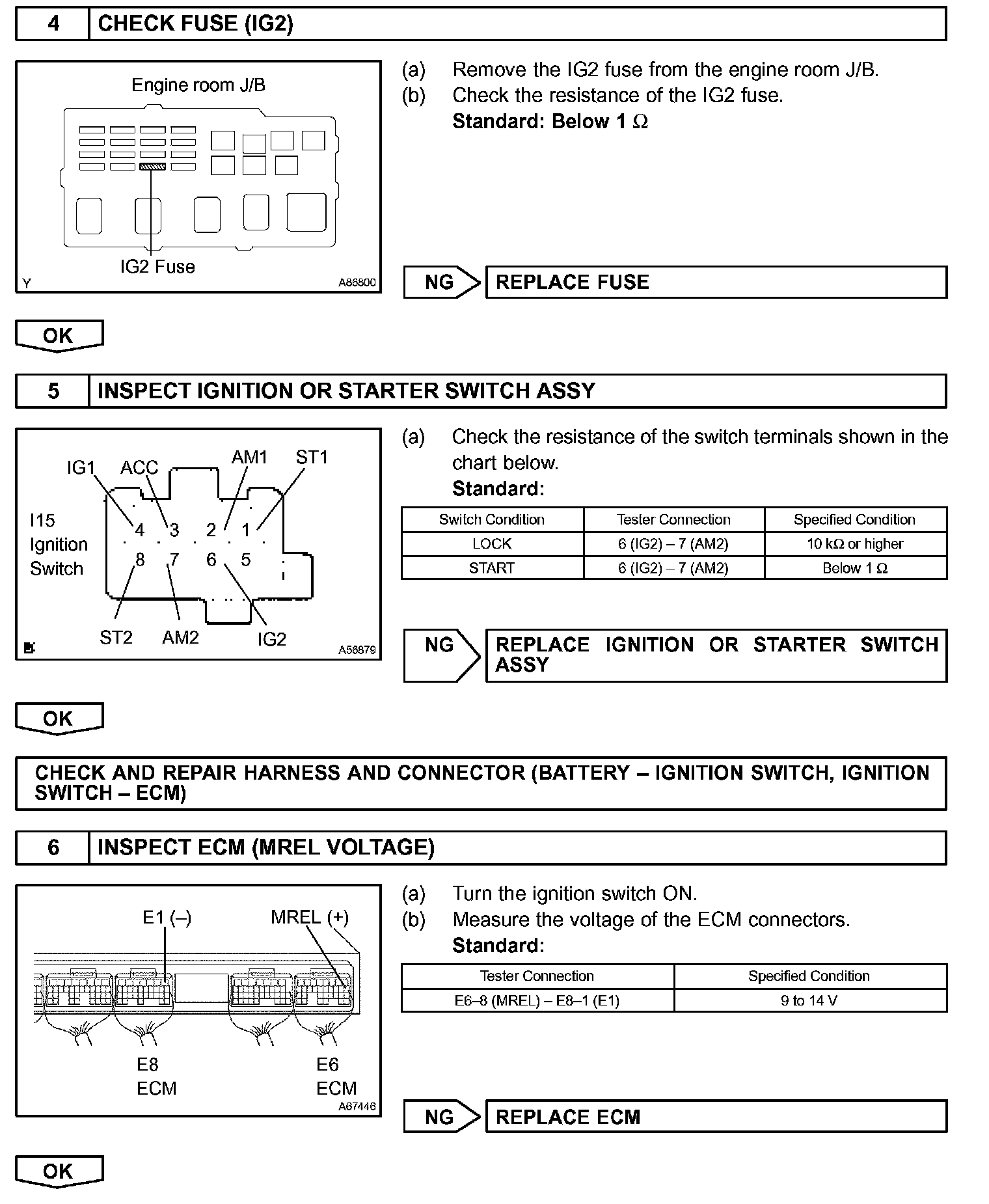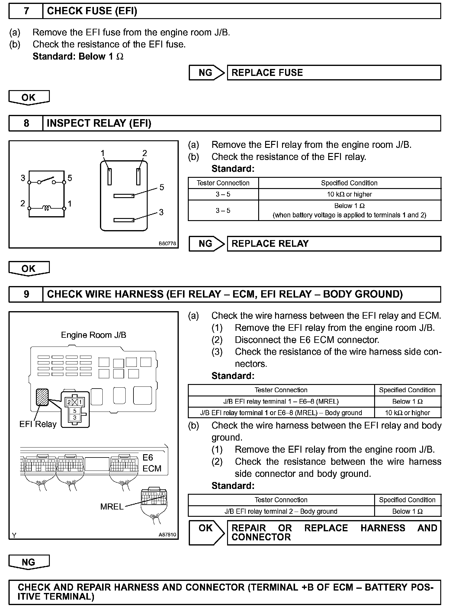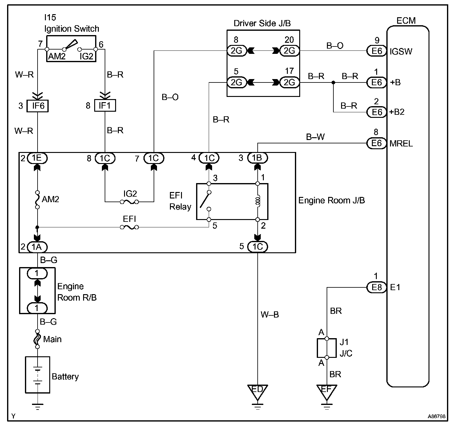 When the ignition switch is turned ON, battery voltage is applied to terminal IGSW of the ECM. The ECM "MREL" output signal causes current to flow to the coil, closing the contacts of the EFI relay (Marked: EFI) and supplying power to terminal +B of the ECM.