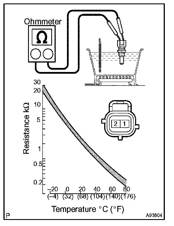 NOTE: If checking the engine coolant temperature sensor in water, be careful not to allow water to intrude into the terminals. After checking, wipe water off the engine coolant temperature sensor.