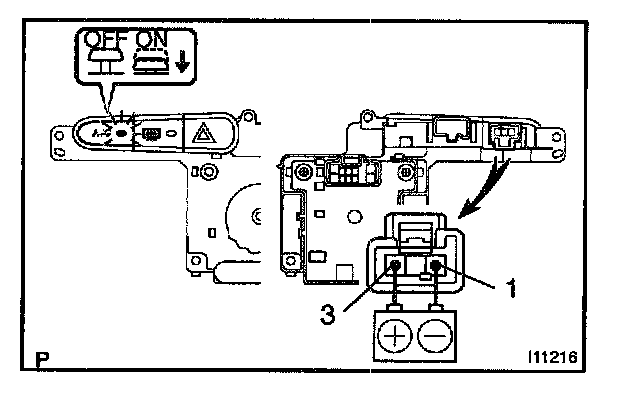Connect the positive (+) lead from the battery to terminal 3 and negative (-) lead to terminal 1, then check that the NC indicator lights up while A/C switch is pressed.
