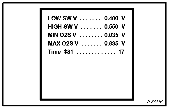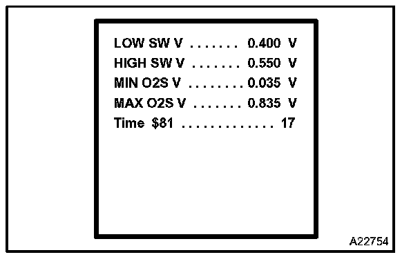NOTE: Until the HO2 sensor monitor runs to completion, when it fails to complete or when the ignition switch is turned to OFF, the tester screen displays the upper and lower viewable limit values for the monitor (for example, voltages: 0 V and 1.275 V, seconds: 0 and 10.2, Test Value: 0 and 255).